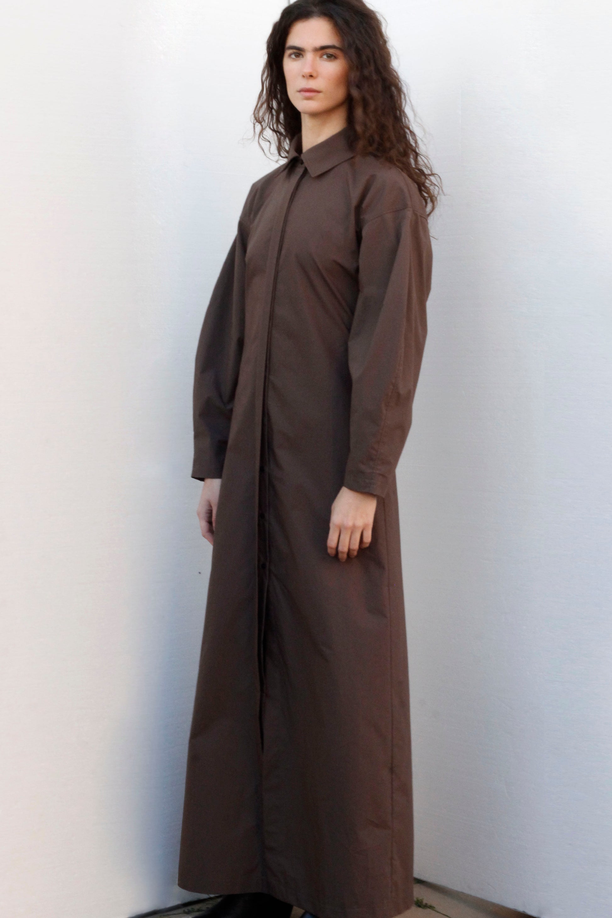 Un vestit llarg teixit amb mànigues globus subtils i una silueta neta i estructurada. Confeccionat amb pinces posteriors per a una forma afavoridora, es tanca amb botons ocults sota una elegant tapeta frontal per a un look minimalista. Disponible en marró i cendra, aquesta peça està confeccionada amb cotó 100% orgànic, cosa que la converteix en una capa transpirable perfecta per a la temporada de tardor. Elegant i versàtil sense esforç, ideal tant per a ús diari com per a un estil elevat.