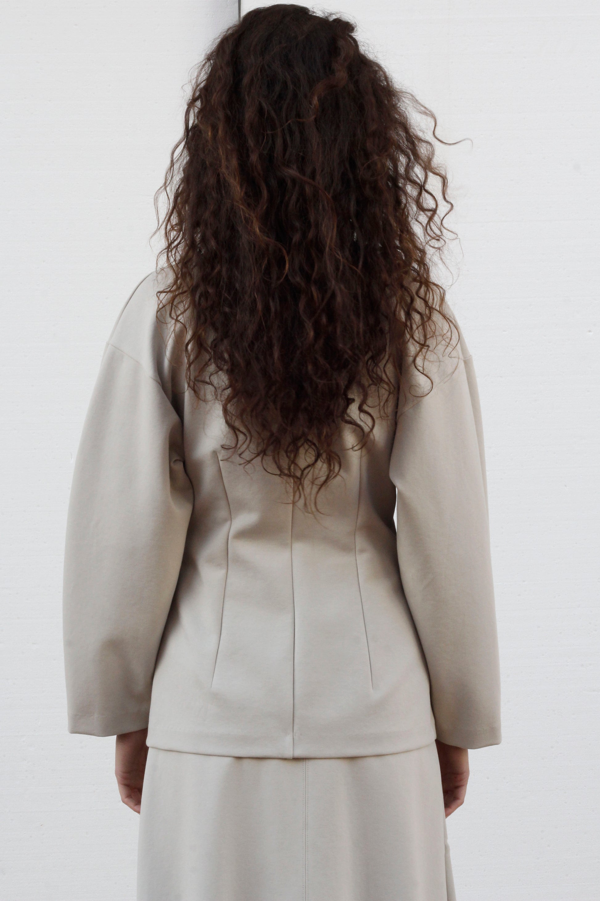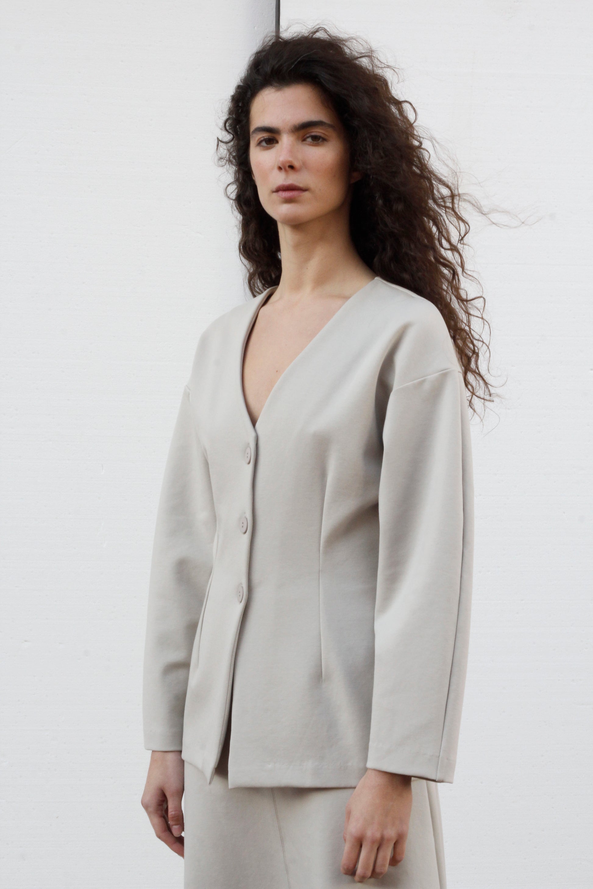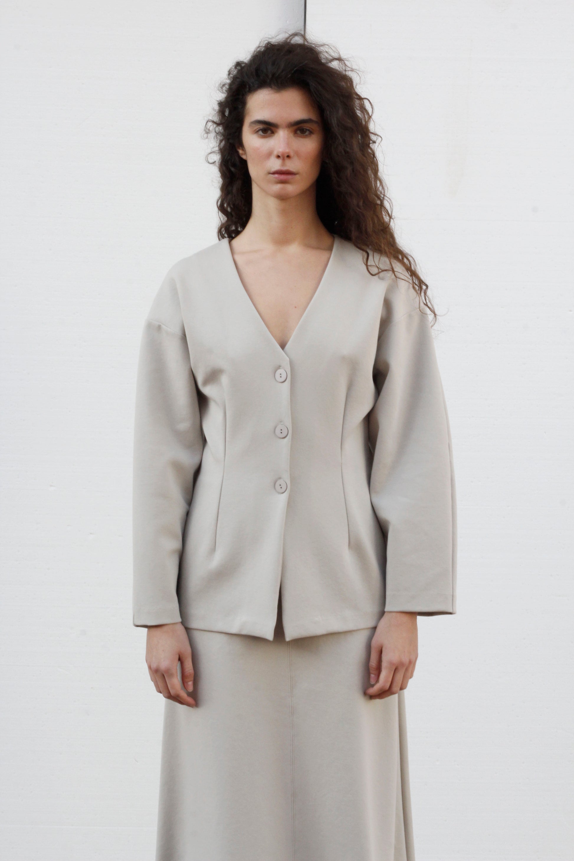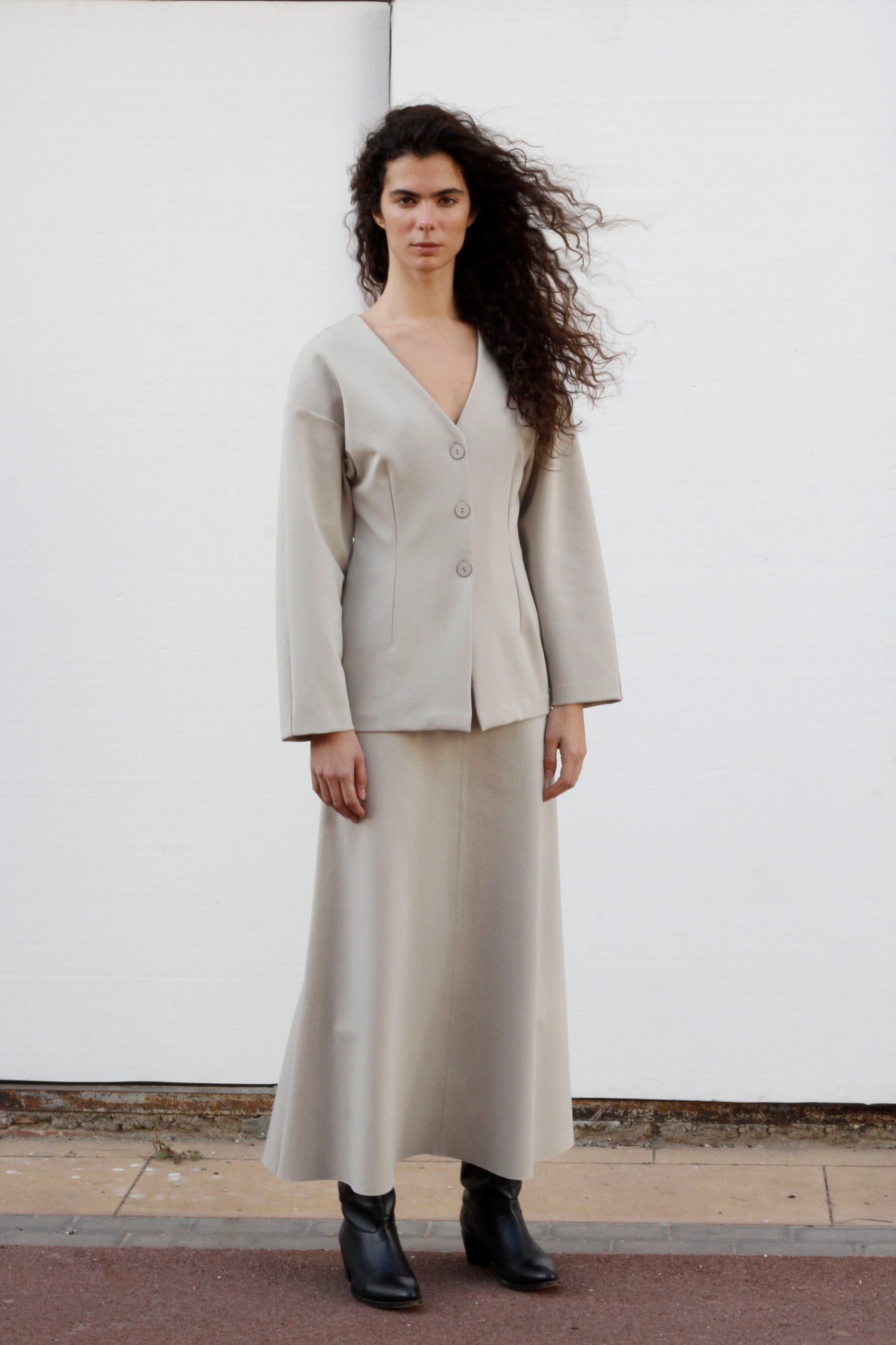Una jaqueta de punt ajustada amb pinces davanteres i posteriors per a una silueta esculpida, amb un tancament de botons net a la part davantera. Dissenyada per combinar-se com a look complet amb la faldilla AEGUAN, ofereix un tacte suau i entallat amb elasticitat per a més comoditat. Disponible en cafè, gris plom i negre: tres tons essencials per crear un conjunt d'hivern refinat.