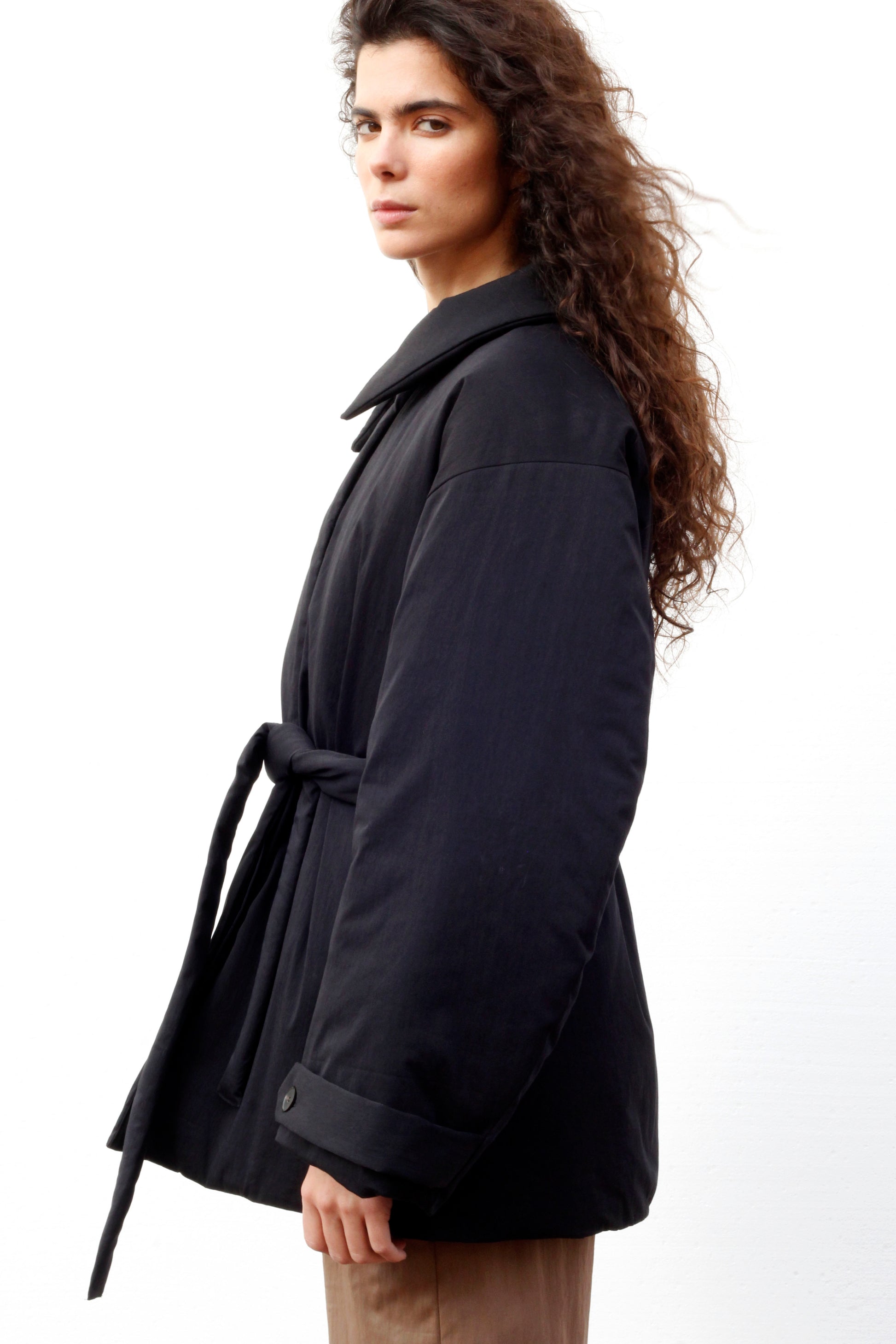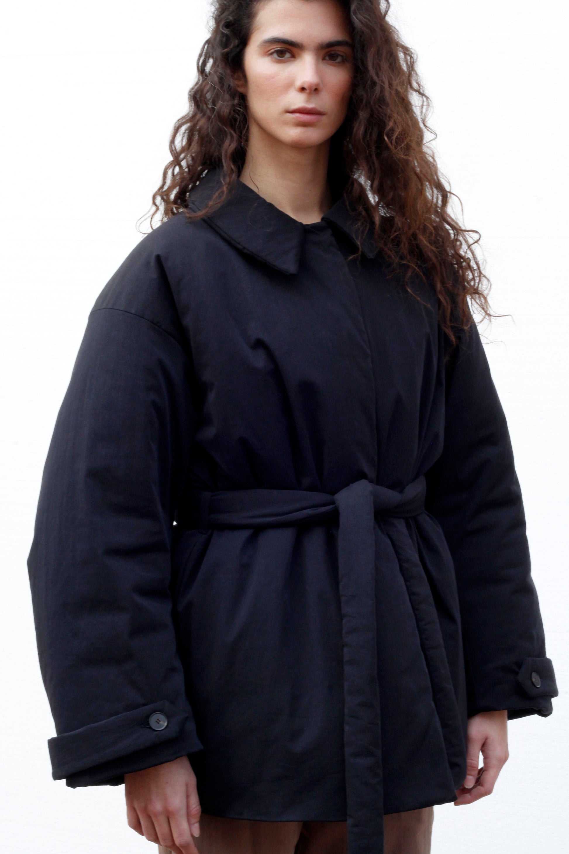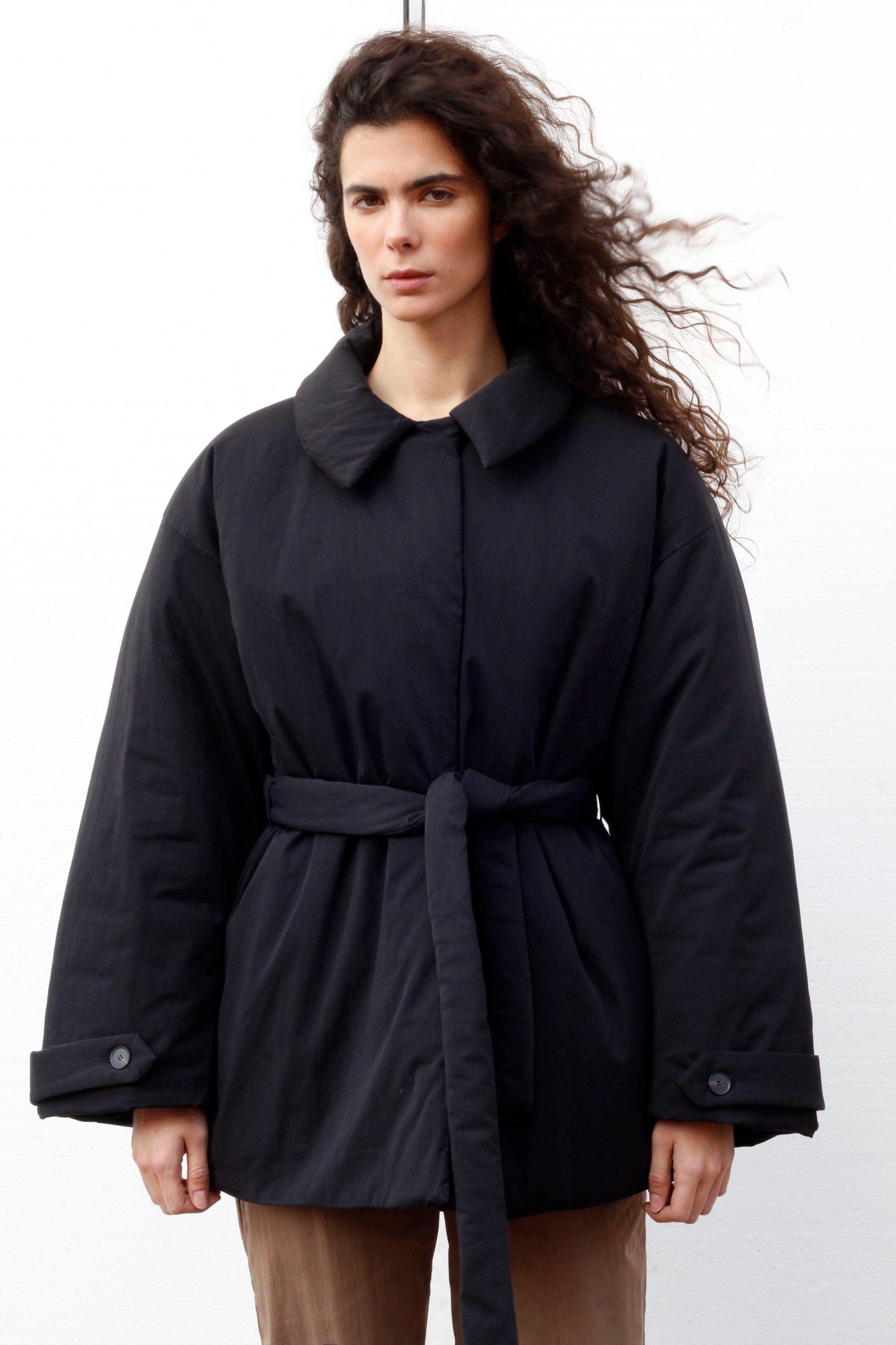 Una jaqueta encoixinada acollidora i extragran disponible en negre i crema. Dissenyada per a l'hivern, presenta una construcció suau i encoixinada i una silueta neta i minimalista. La jaqueta inclou un cinturó per cenyir la cintura i ajustar l'ajust, però també inclou botons ocults per tancar. La seva forma relaxada i el seu disseny atemporal la converteixen en una peça de roba d'abric perfecta per als dies freds.