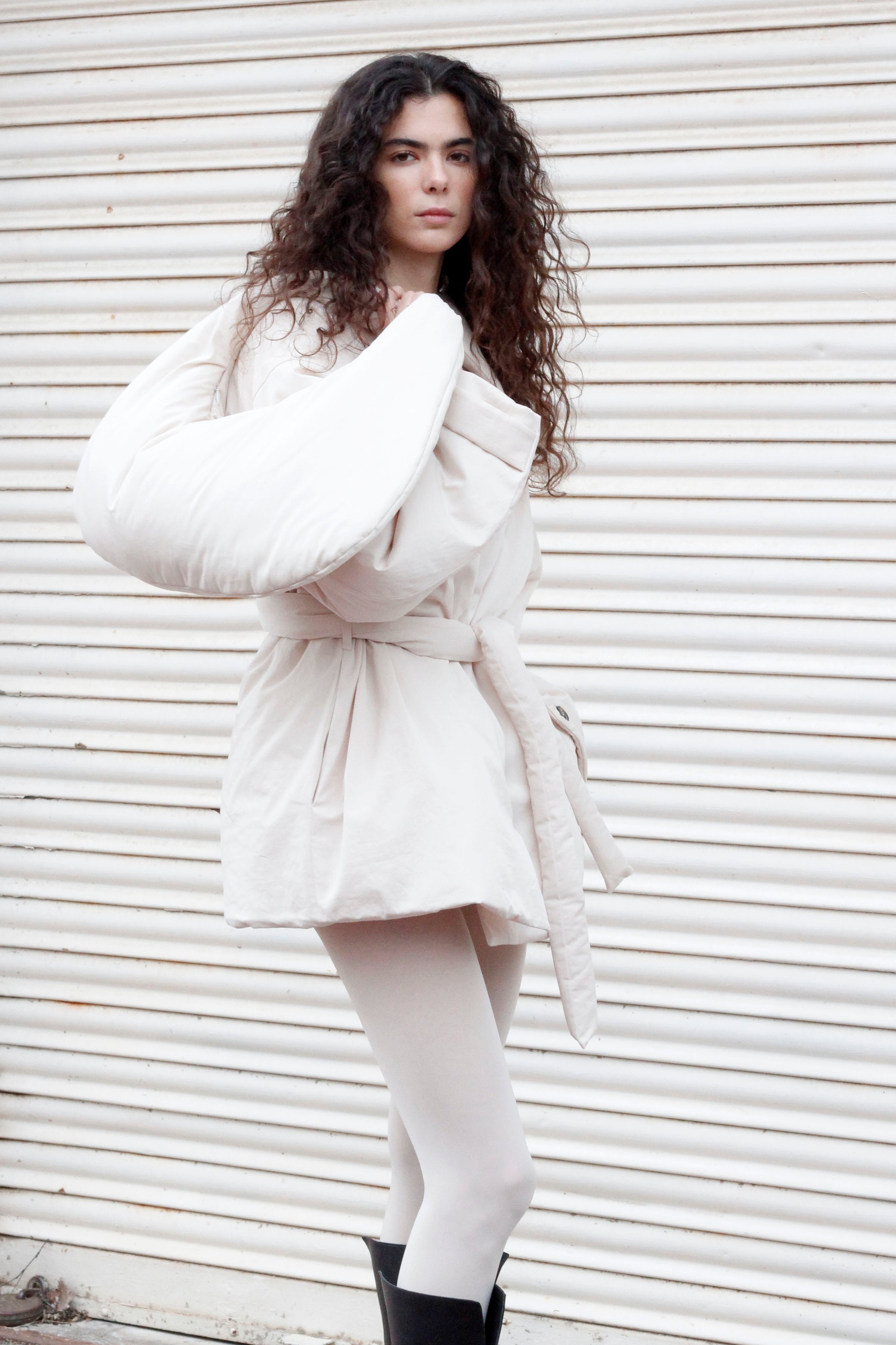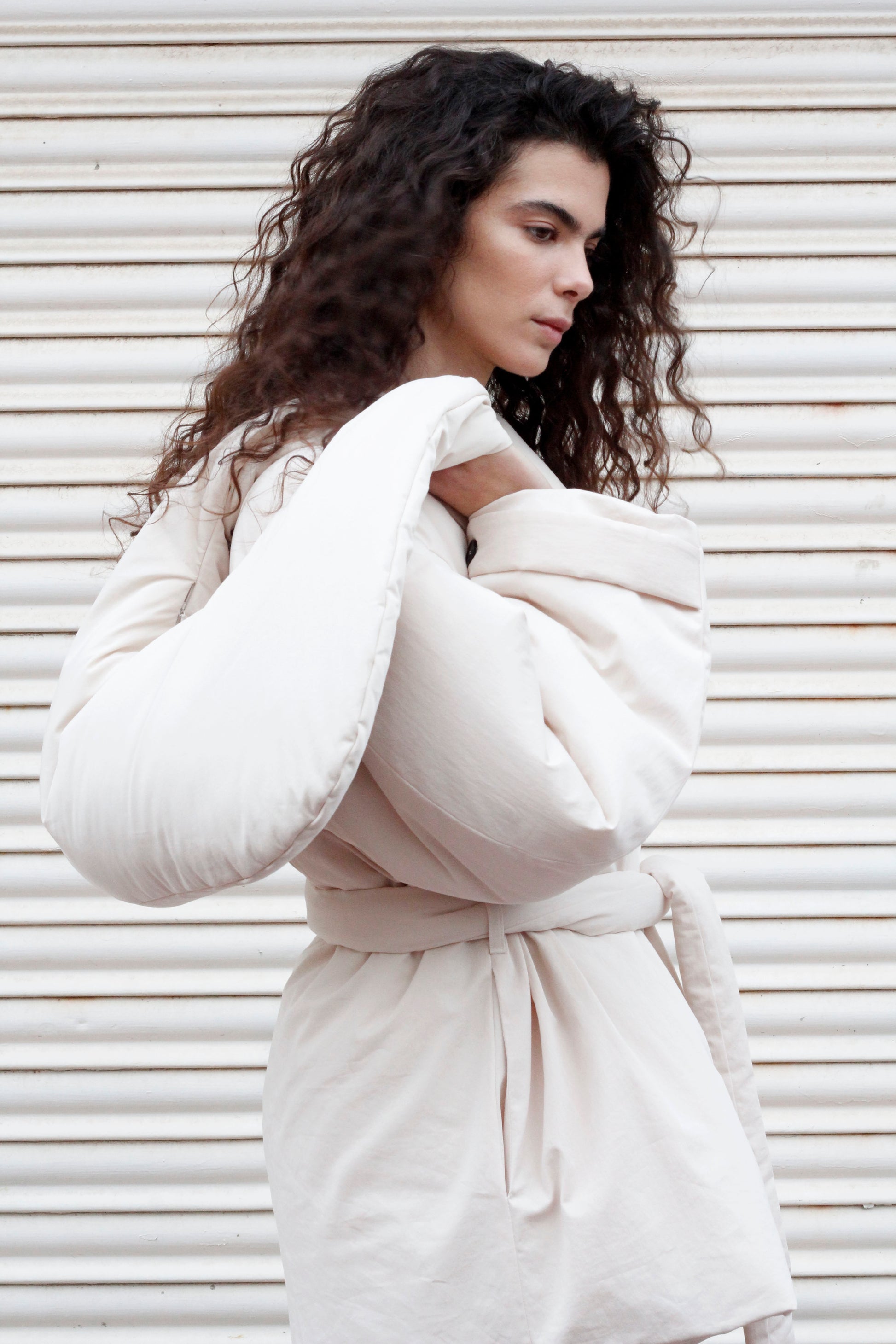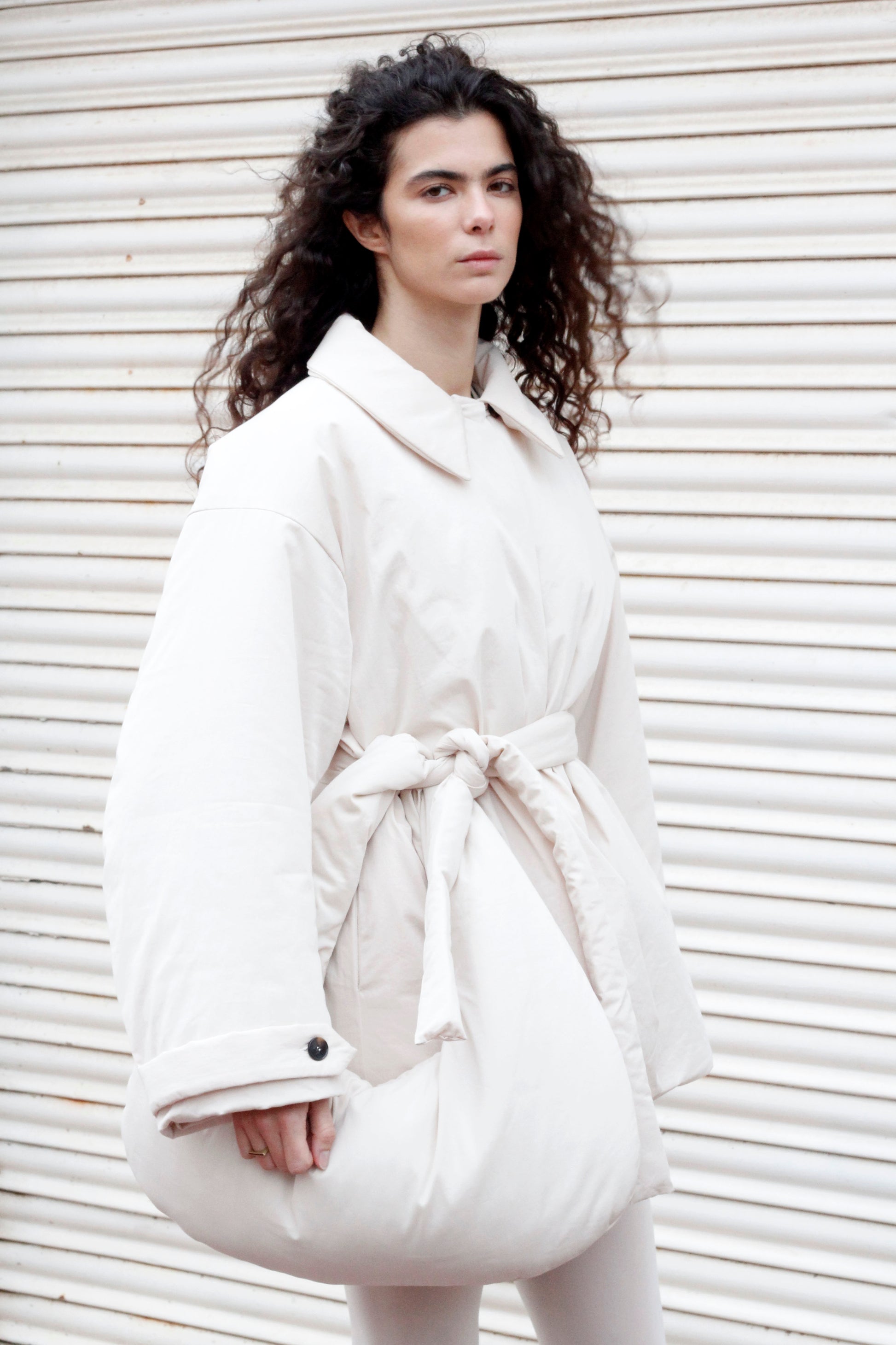 Aquesta bossa escultural encoixinada, disponible en crema i negre, redefineix la suavitat a través de la forma. Elaborada amb una silueta voluminosa i una textura suau, reflecteix la comoditat de la roba d'abric alhora que manté una declaració atrevida i moderna. La seva construcció lleugera però estructurada proporciona un transport còmode i un impacte visual. Tant si es porta a l'espatlla com si es col·loca al braç, aporta calidesa i fluïdesa als conjunts d'hivern: una peça que difumina la línia entre la funció i la moda.