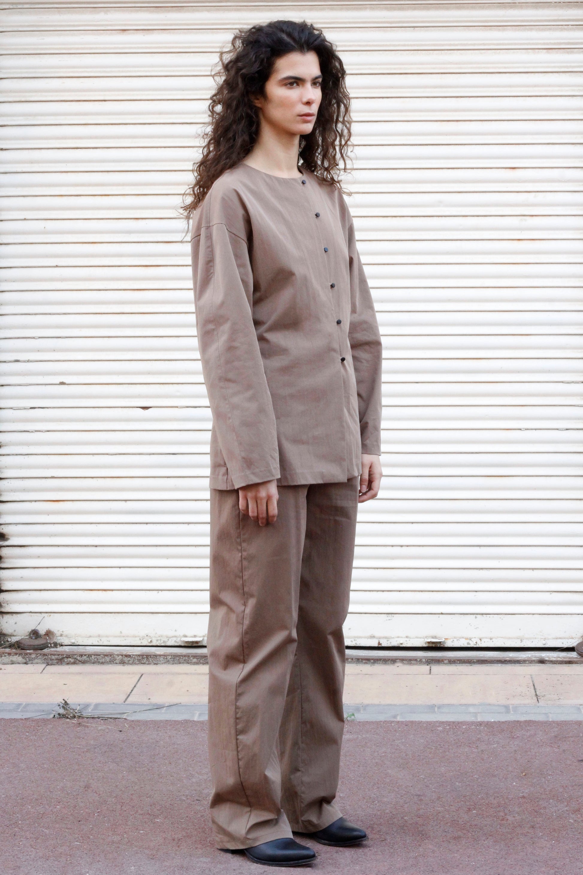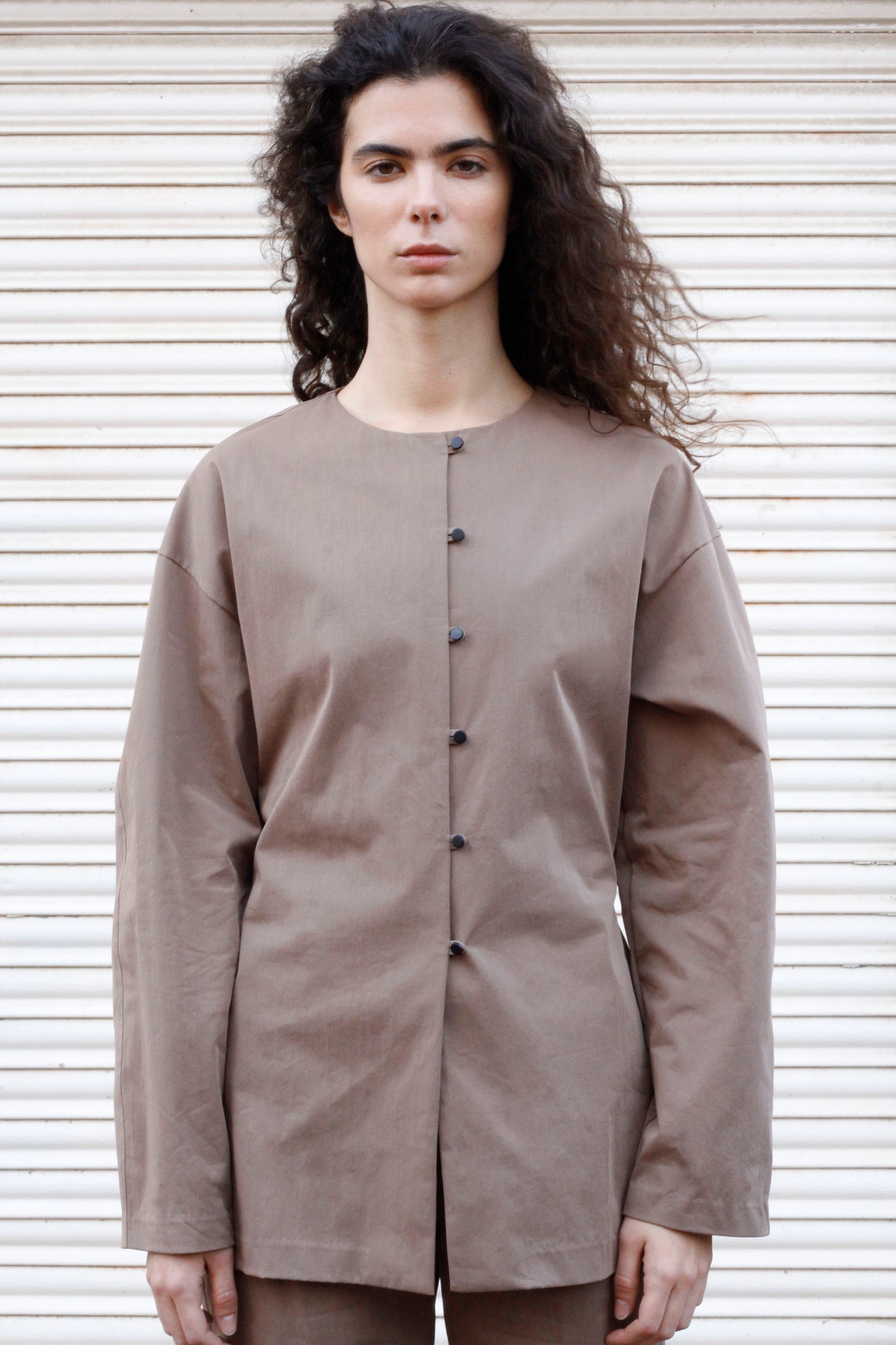 Una camisa única amb botons, amb una tapeta frontal impecable, un detall subtil de corbata i botons distintius que eleven la seva silueta minimalista. Confeccionada amb una barreja suaument estructurada de cotó orgànic i fibres reciclades, equilibra la textura amb la fluïdesa. Dissenyada per combinar amb els pantalons Glass com a look complet. Disponible en color topo i negre.