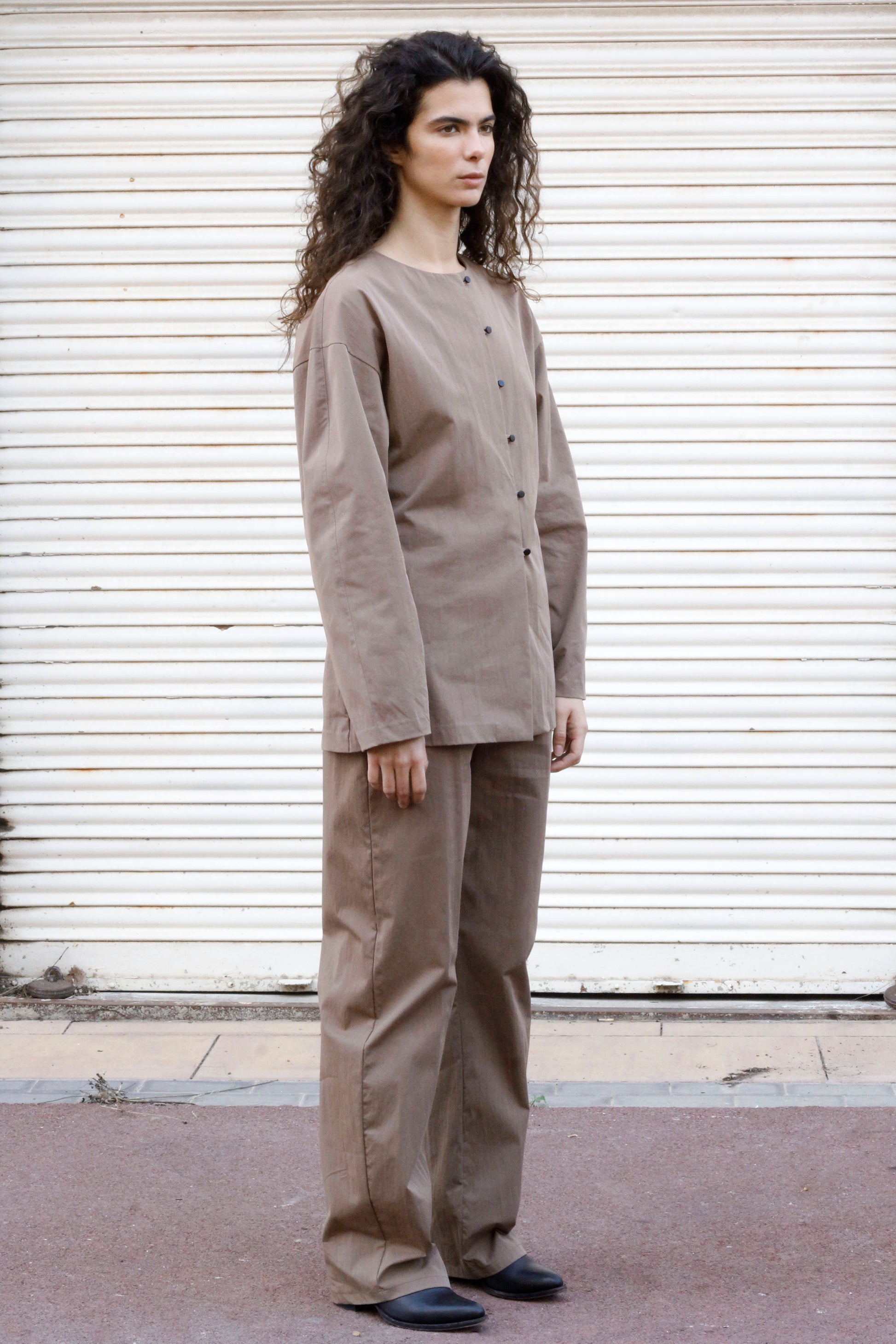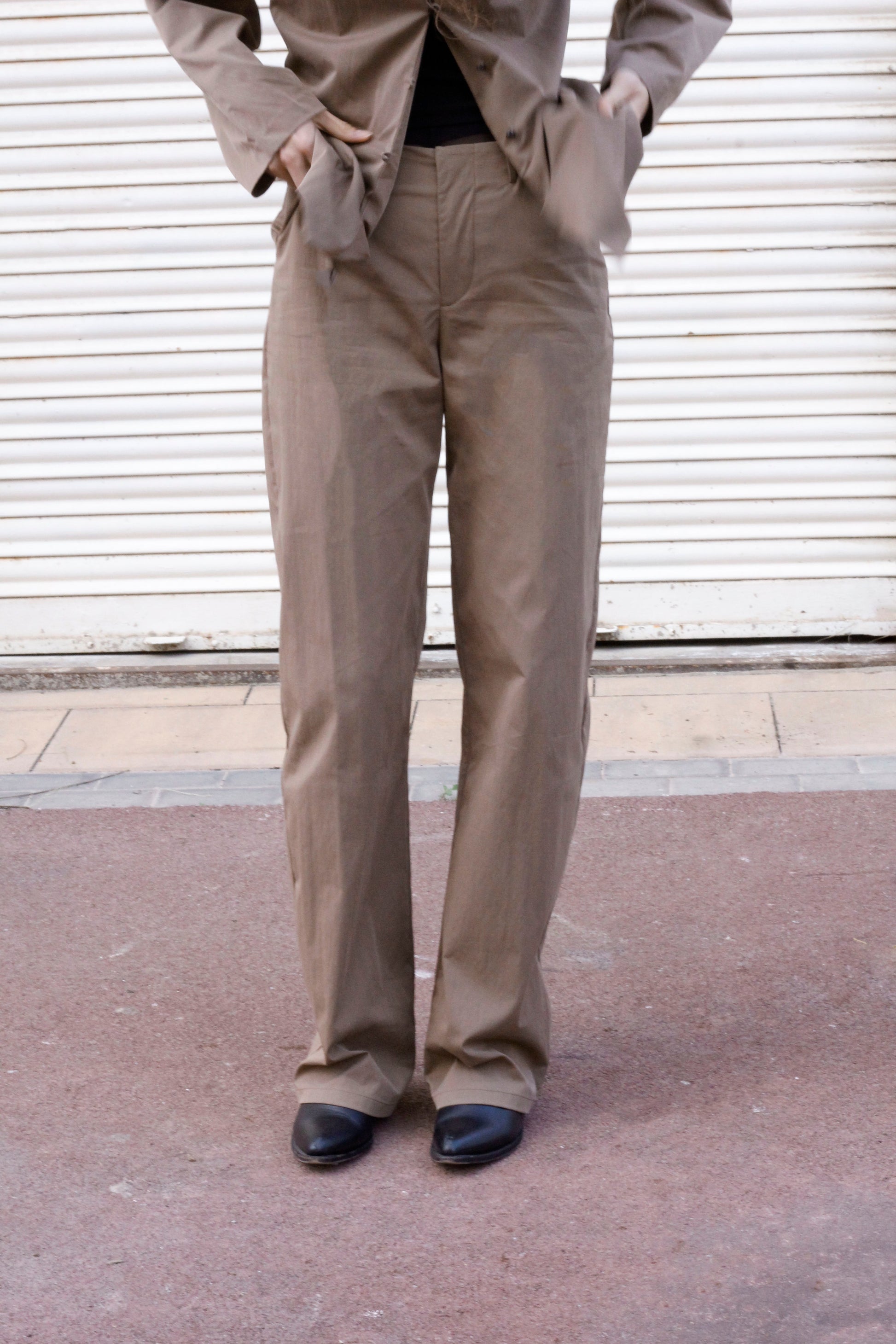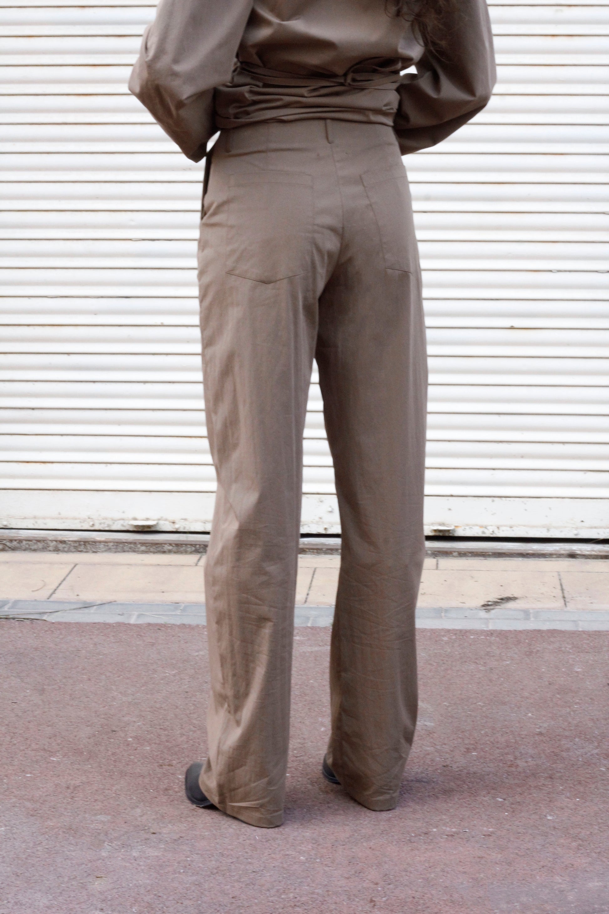 De cintura alta amb una cama voluminosa que s'estreny al turmell, creen una forma arrodonida i arquitectònica. Dissenyades per combinar amb la part superior a joc o amb qualsevol cosa, des de punt curt fins a camises nítides, ofereixen un aspecte relaxat però estructurat amb un moviment fluid. Una cintura elàstica proporciona comoditat, mentre que la textura teixida nítida afegeix definició. Disponibles en color topo i negre.