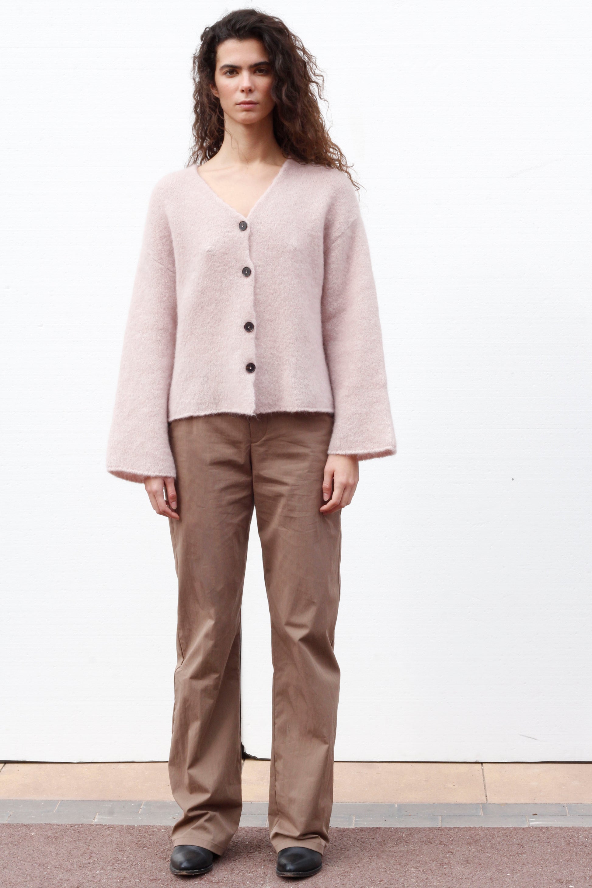 Un cardigan lleugerament curt amb coll en V fet d'una càlida barreja d'alpaca i llana. Presenta una tancament frontal impecable amb botons i subtils acabats de canalé, que ofereixen un ajust cenyit però còmode. Disponible en verd fosc i rosa, tons ideals per a looks suaus i a capes.
