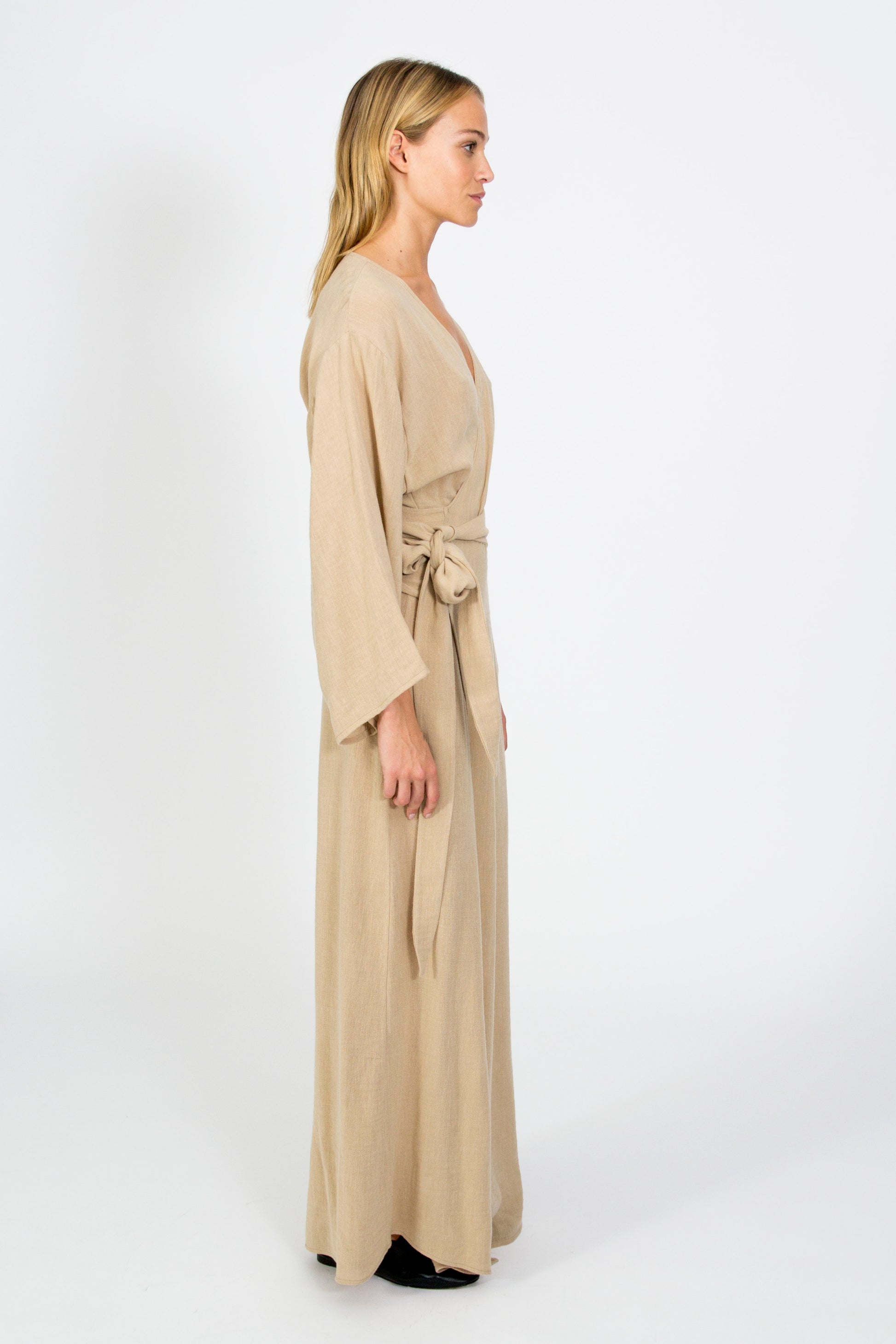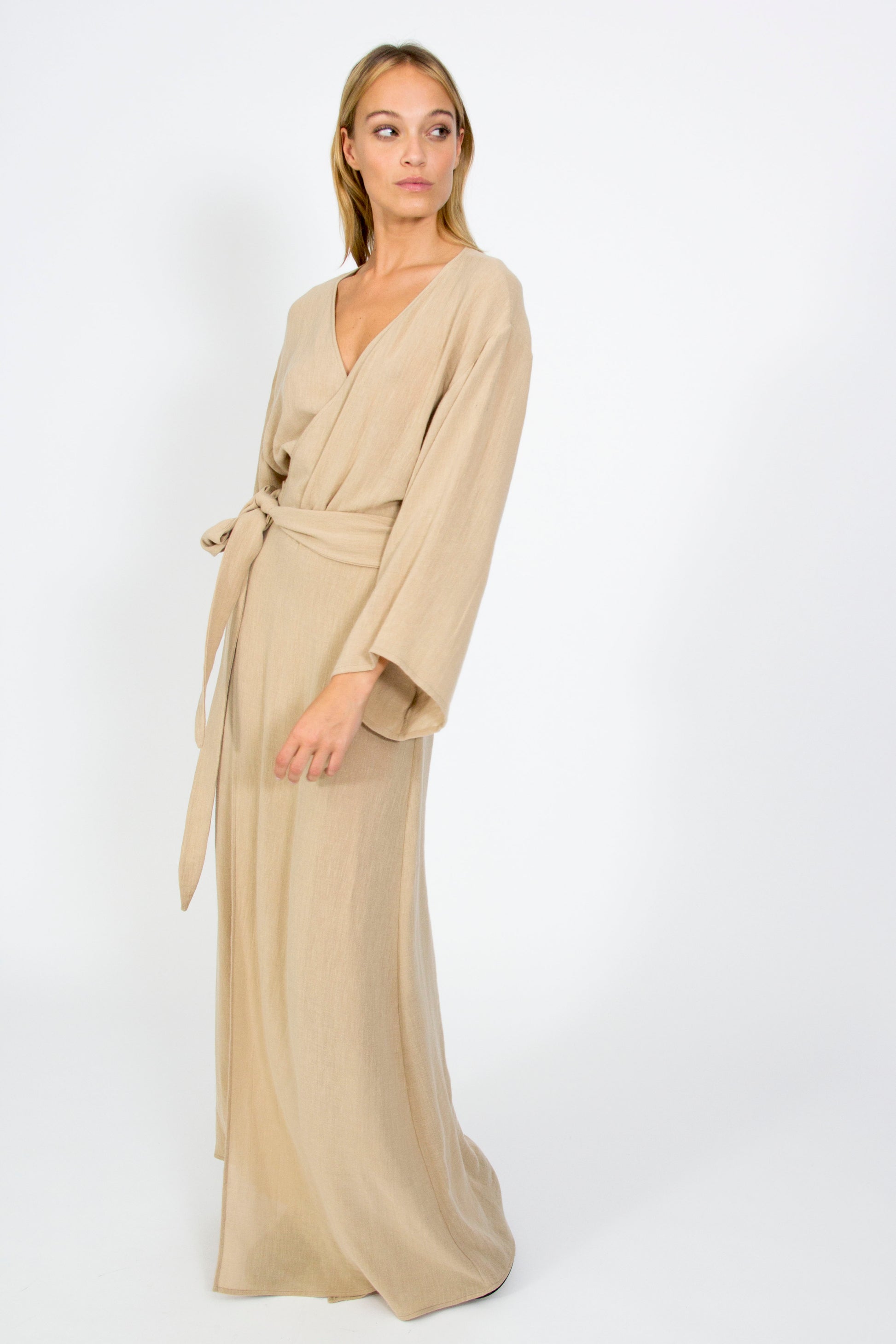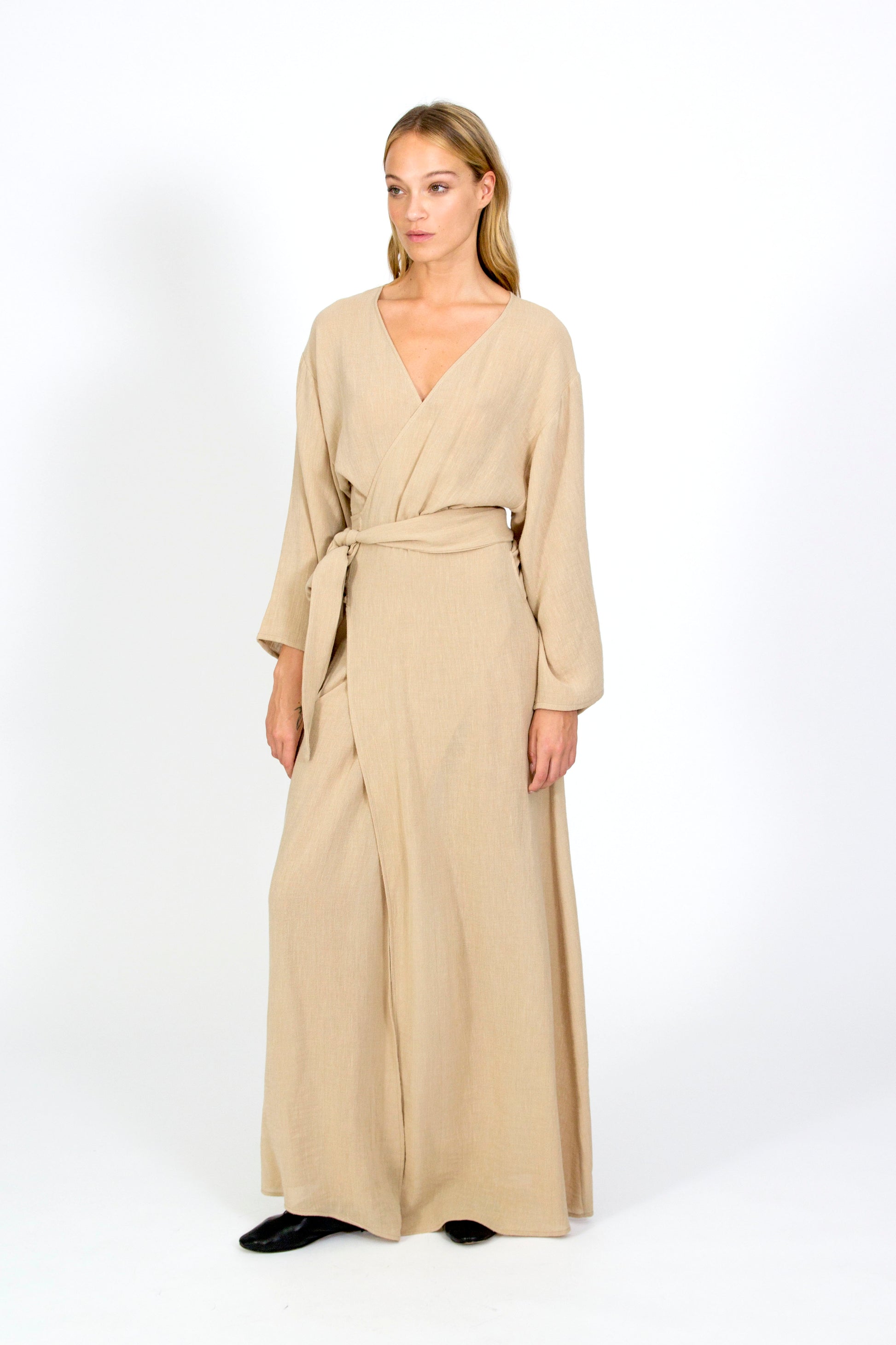 This long beige linen dress has a relaxed style. With a wrap-around design, it ties at the waist with a belt, leaving long ties that hang down. The lightweight linen fabric makes it perfect for warm weather, offering a comfortable and effortless look.