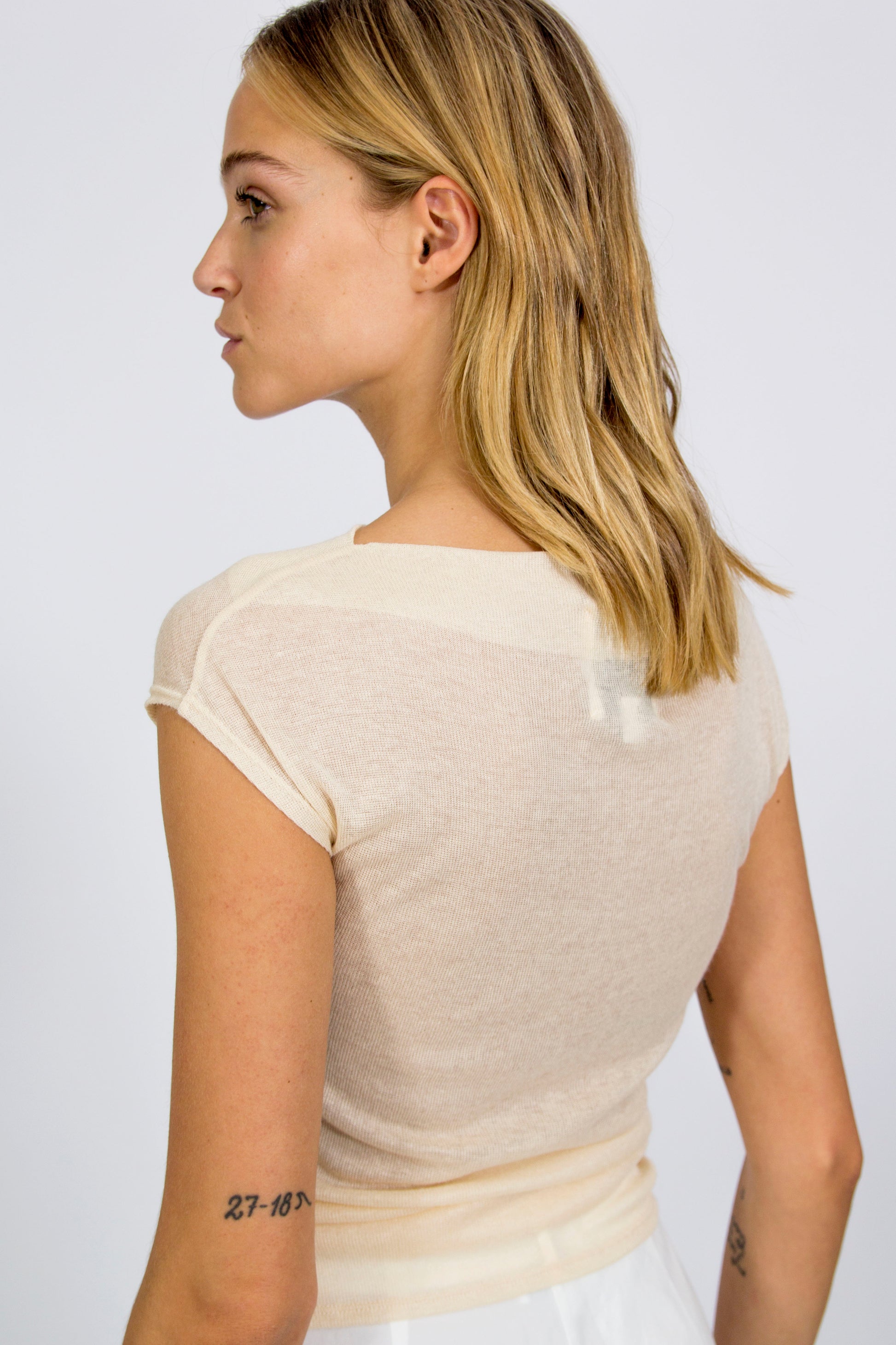 Inspirada en nuestro icónico top Vollmond, hemos creado una versión fresca y versátil. Confeccionada con el mismo tejido delicado y sutilmente transparente, es la prenda perfecta tanto para el día como para la noche este verano. Con escote barco y mangas cortas, aporta un toque de estilo informal y comodidad.