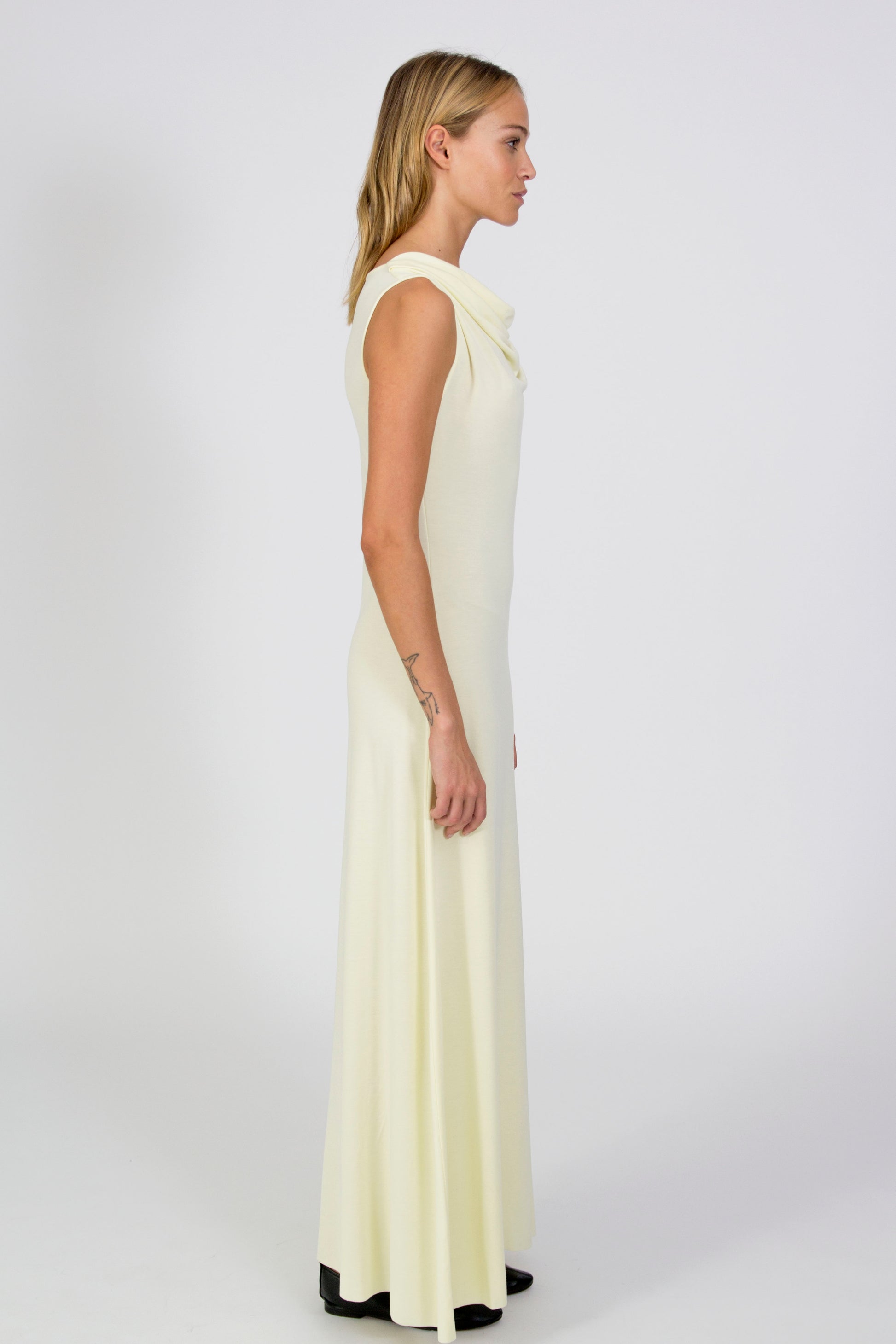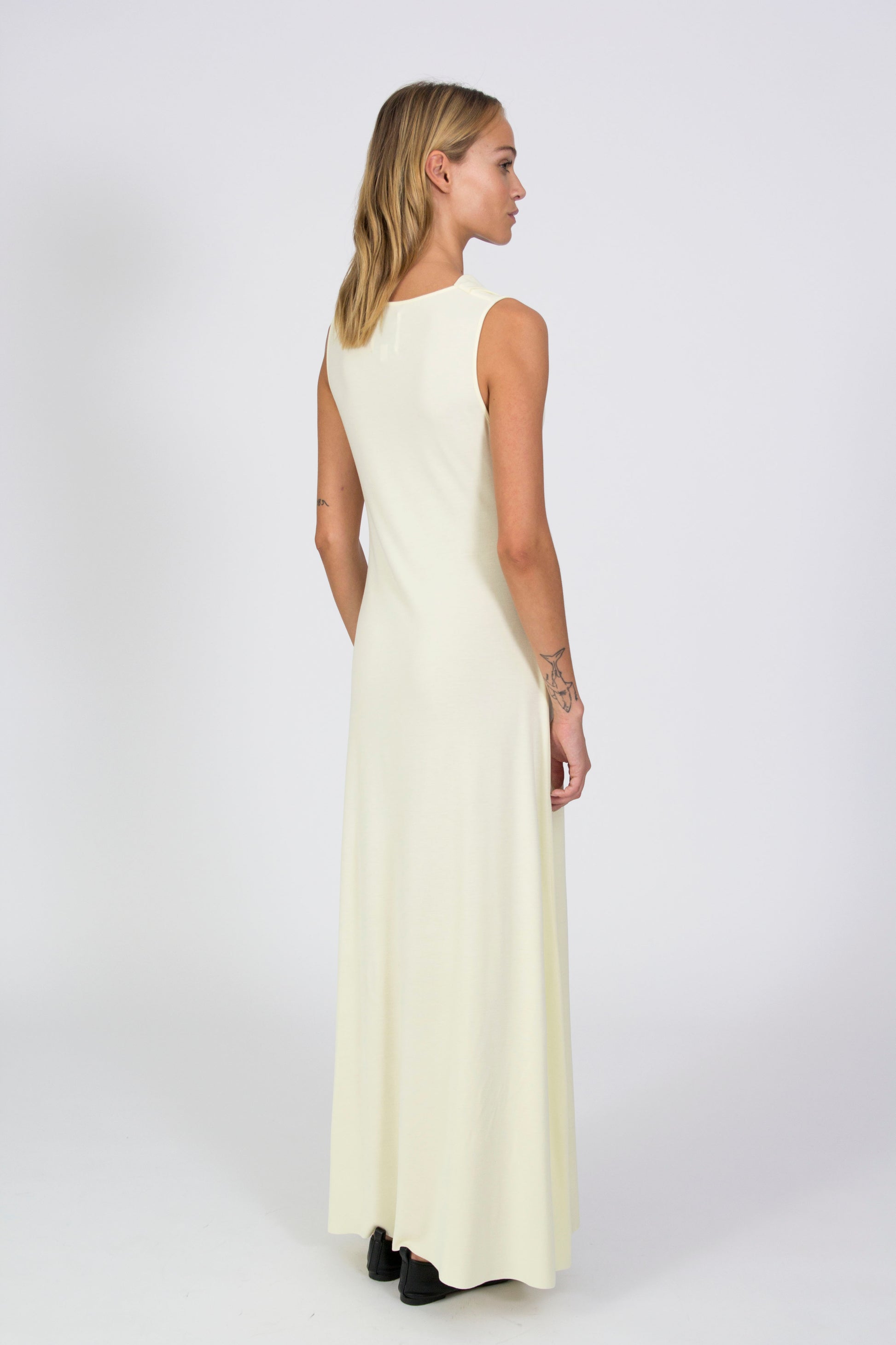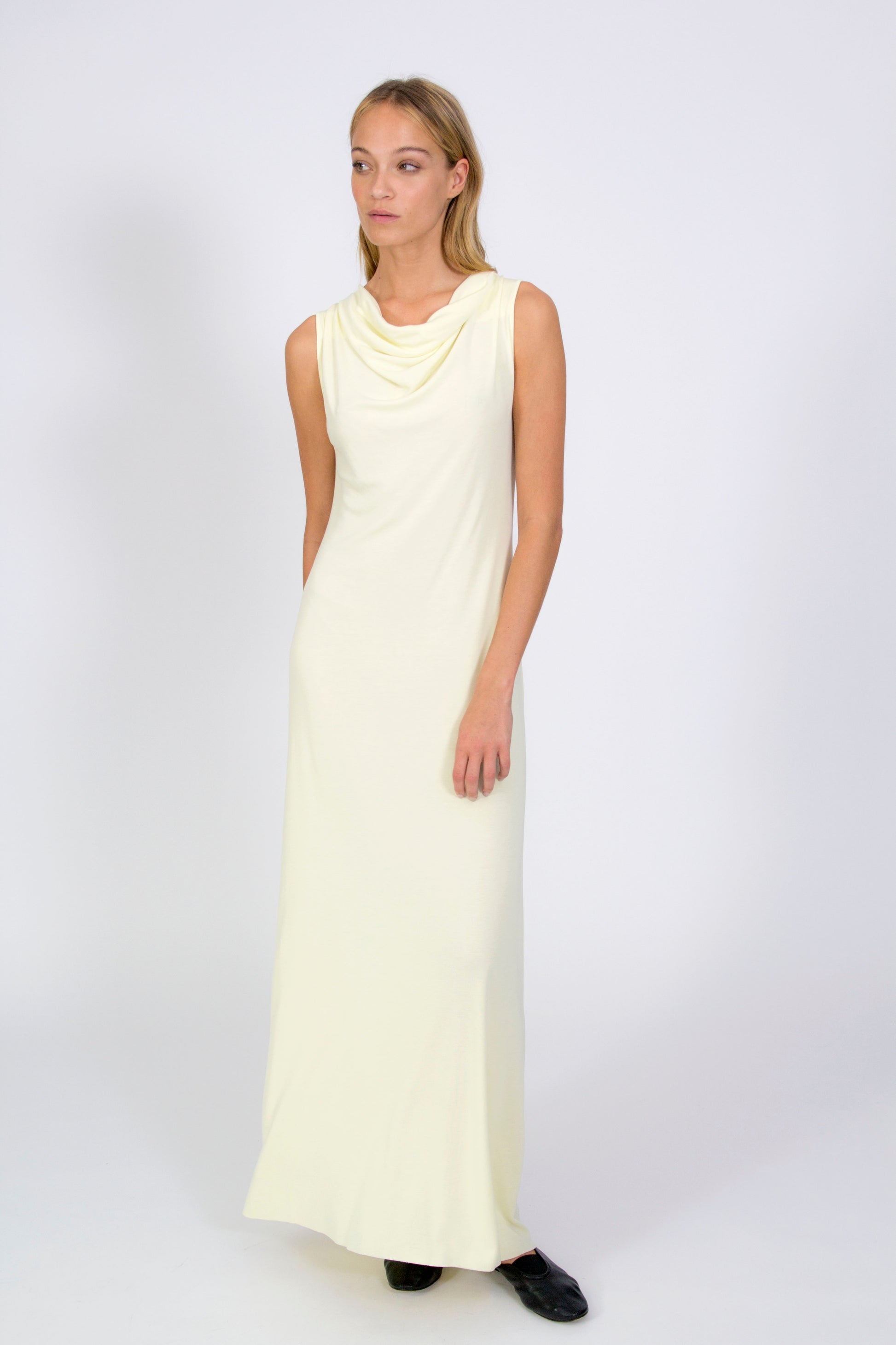 Designed for special occasions, this Drapey Sleeveless Dress blends fluidity with a striking silhouette. Crafted from soft, breathable Tencel, it falls elegantly to the feet, creating a graceful and effortless look. The beautifully draped neckline adds a unique, refined touch, making it a standout choice for evening events or celebrations. Available in classic black and yellow.