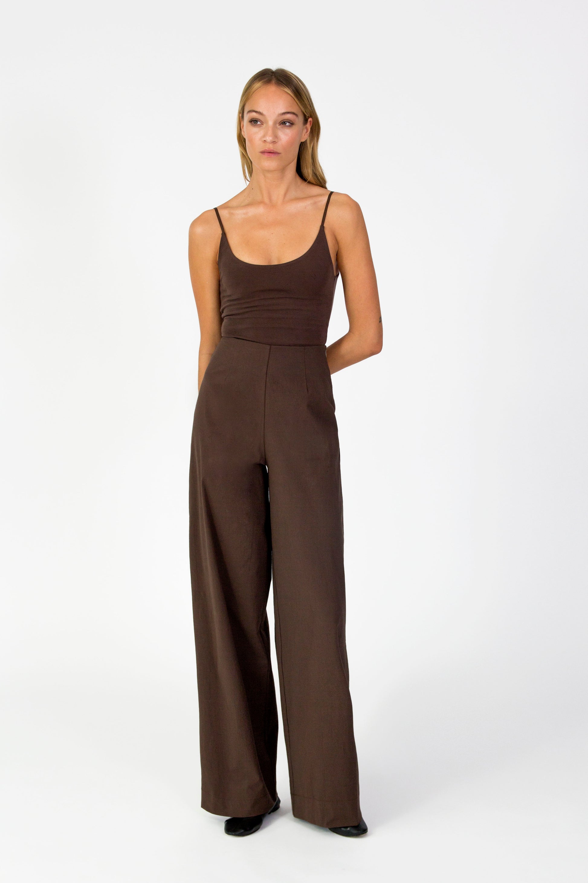 A sleek and minimalist staple. This spaghetti-strap bodysuit is crafted from soft, stretchy fabric for a second-skin feel and a flattering fit. Featuring a scoop neckline and a seamless silhouette, it’s perfect for layering or wearing on its own. Designed for both style and convenience, it fastens with snap buttons for a secure fit. Available in timeless shades of red, black, and brown, this versatile piece is an essential addition to any modern wardrobe.