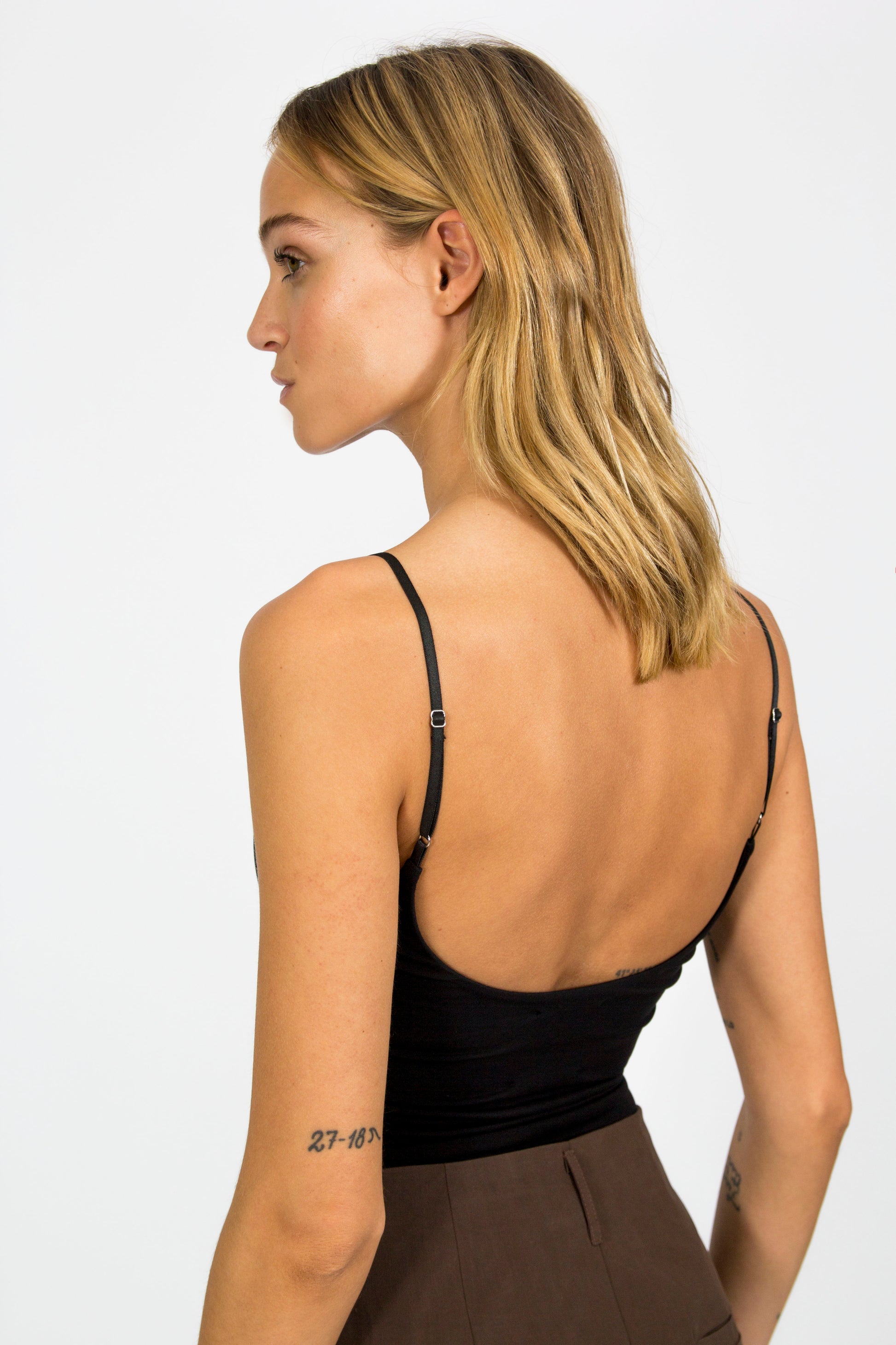 A sleek and minimalist staple. This spaghetti-strap bodysuit is crafted from soft, stretchy fabric for a second-skin feel and a flattering fit. Featuring a scoop neckline and a seamless silhouette, it’s perfect for layering or wearing on its own. Designed for both style and convenience, it fastens with snap buttons for a secure fit. Available in timeless shades of red, black, and brown, this versatile piece is an essential addition to any modern wardrobe.
