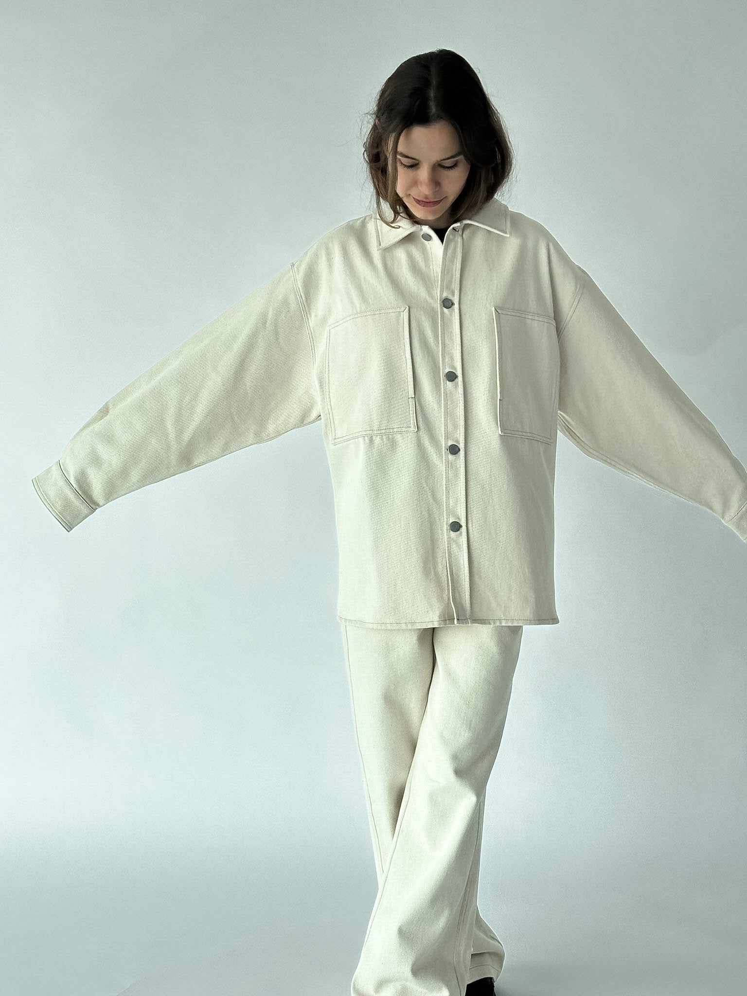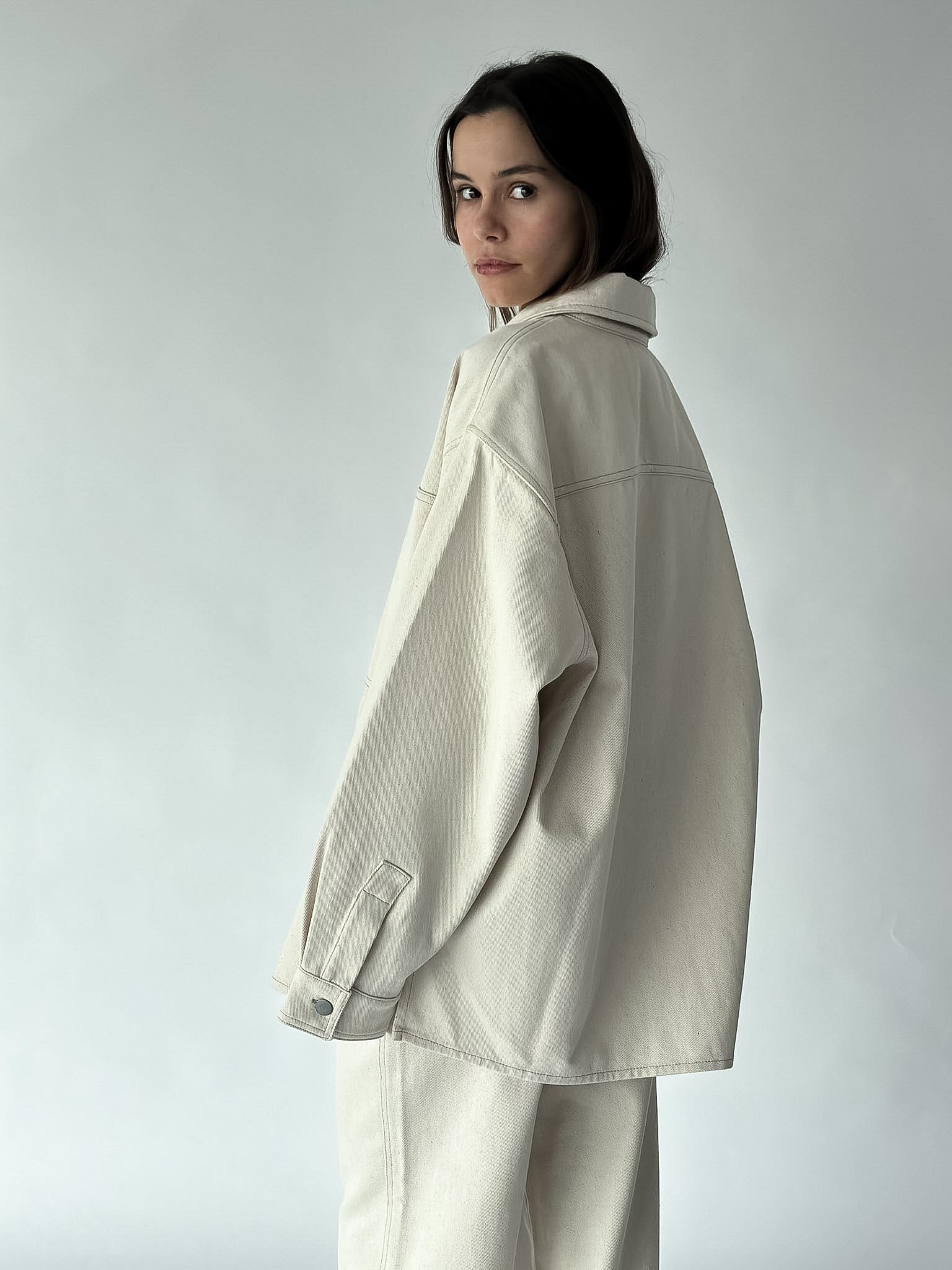 A minimalist staple, the Ida Jacket is constructed from 100% BCI cotton. Featuring a collared neckline with a buttoned-down front, the jacket also has a secret chest pocket that fits a phone. Wear with our Ecru Trousers for a modern update on classic casual attire.