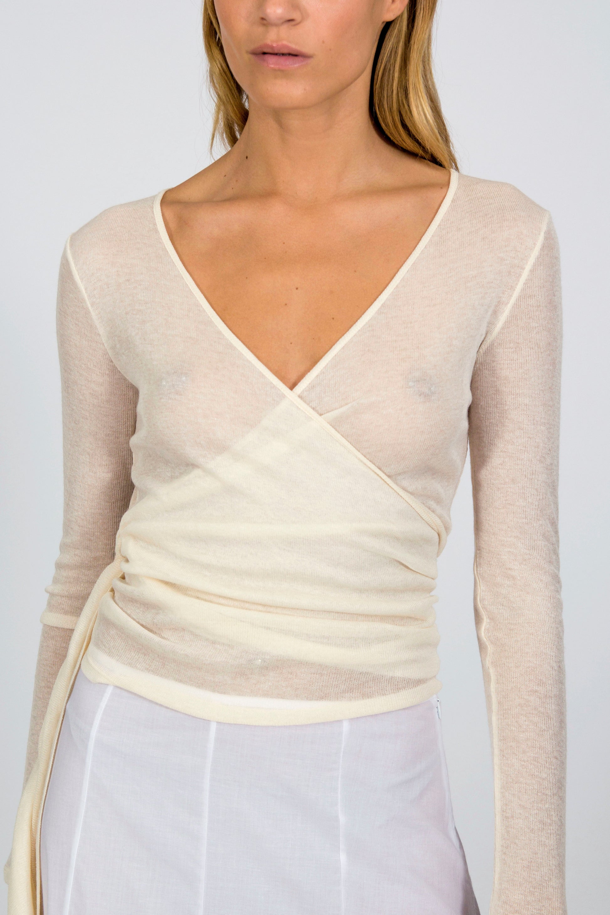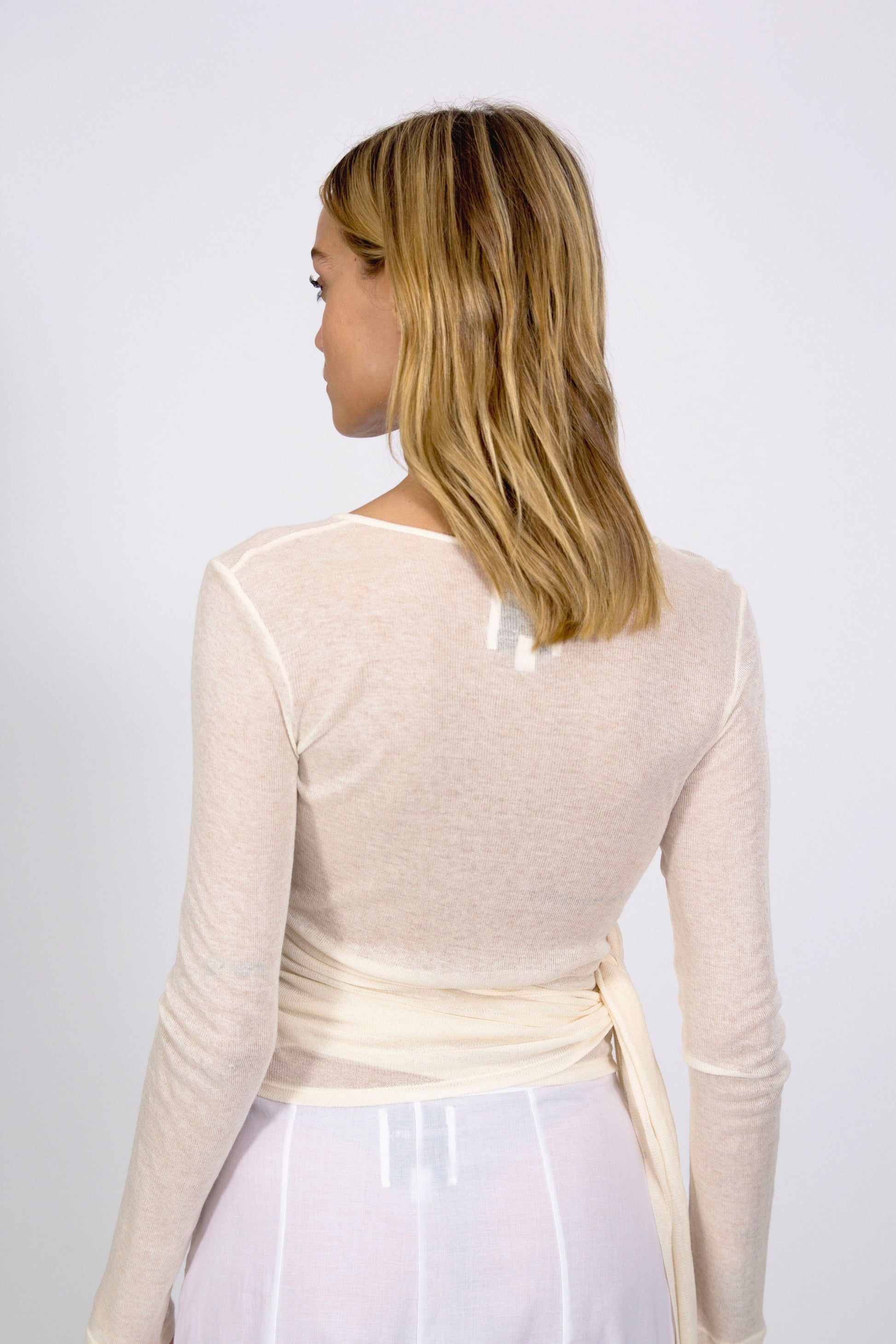 This top is a true gem for your wardrobe. Made from Tencel, its lightweight and delicate fabric offers a subtle sheerness that adds an elegant touch. The wrap-around design ties at the waist, allowing for an adjustable fit while creating a flattering neckline. With long sleeves and a sophisticated off-white shade, this piece is perfect for those who love a minimalist yet statement look—ideal to pair with dresses, skirts, or tailored trousers.