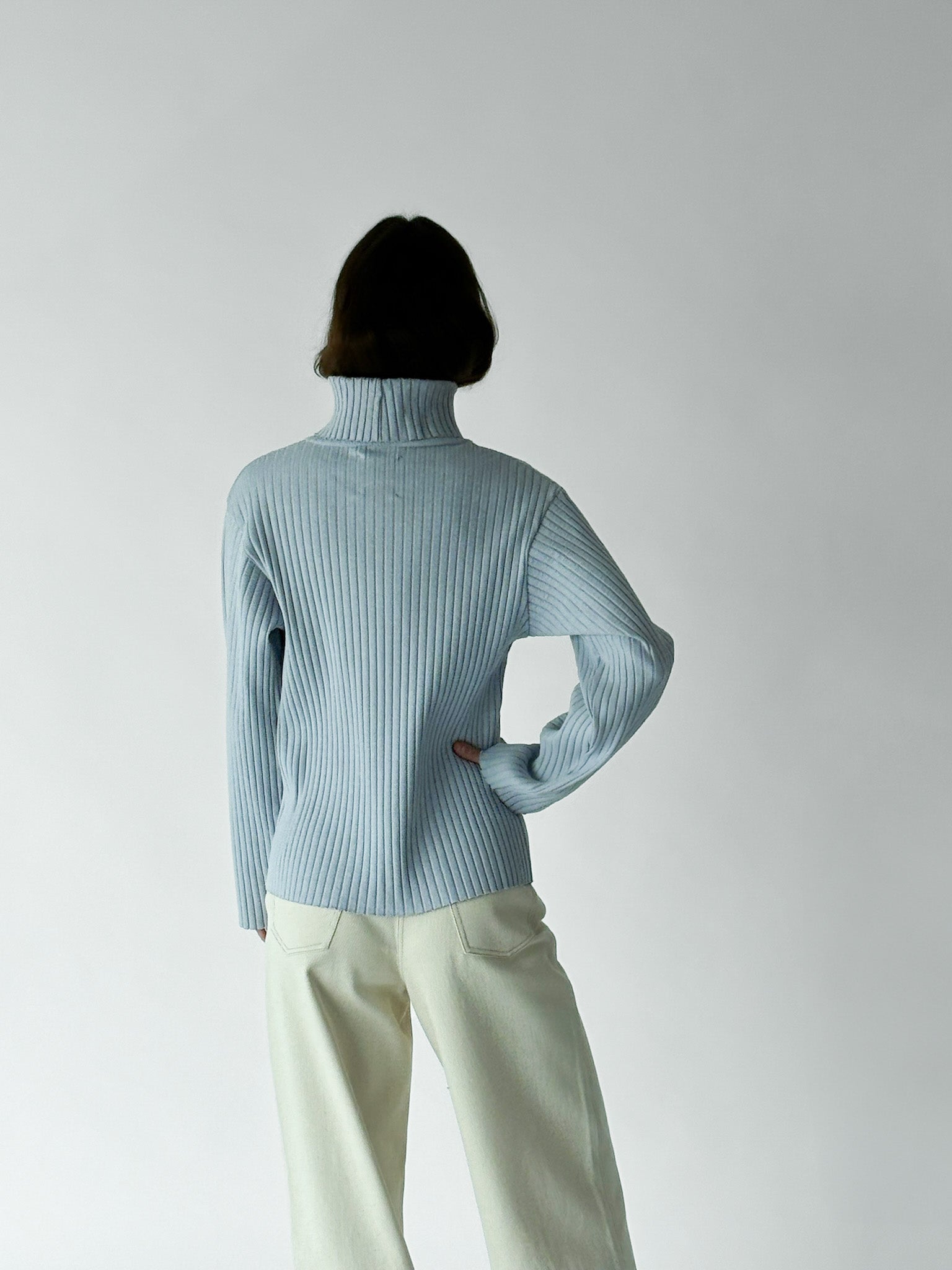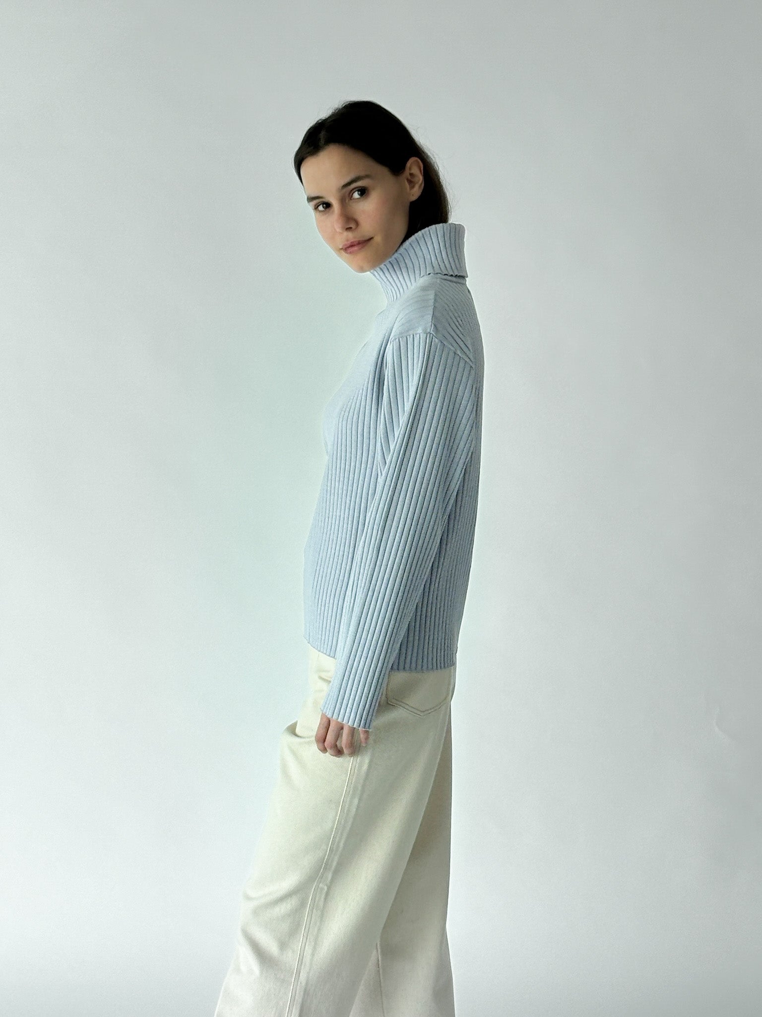 Wrap yourself in cozy comfort and contemporary style with our Skyscape Jumper. This roll-neck jumper is crafted from a blend of organic cotton, recycled cotton, and elastane – its soft and stretchy fabric provides a luxurious feel. A cool-weather staple, the Skyscape Jumper is an ideal layering piece for autumn and winter. Flared sleeves and panel line detailing add a touch of modern flair and sophistication. Pair with our Ecru Trousers for a chic and versatile outfit.