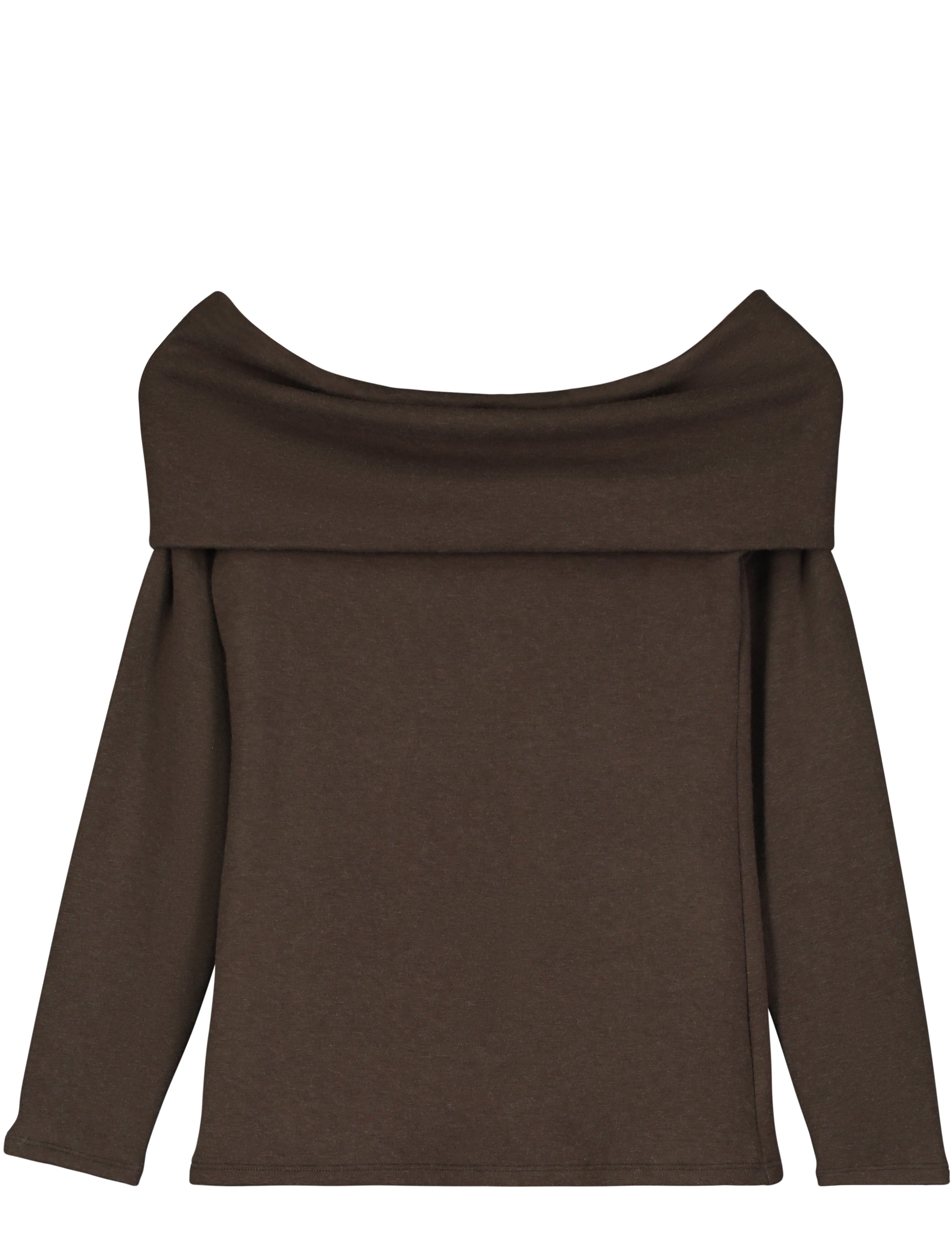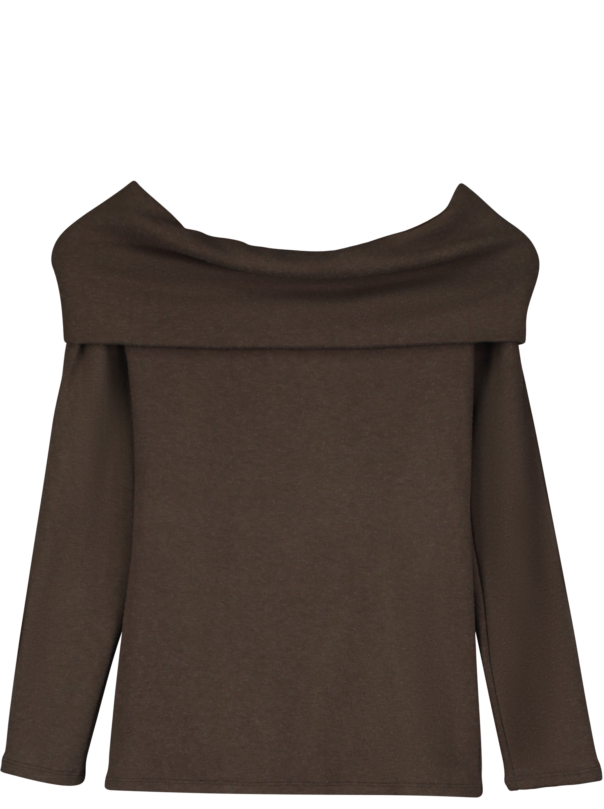 This long-sleeved top features a folded bardot neckline and a softly flared silhouette that drapes gently over the body. Its surface has a smooth, brushed feel with subtle stretch, offering warmth and comfort without bulk. Available in black, ecru, and stone, it moves easily between day and evening settings, making it a refined essential for the colder months.