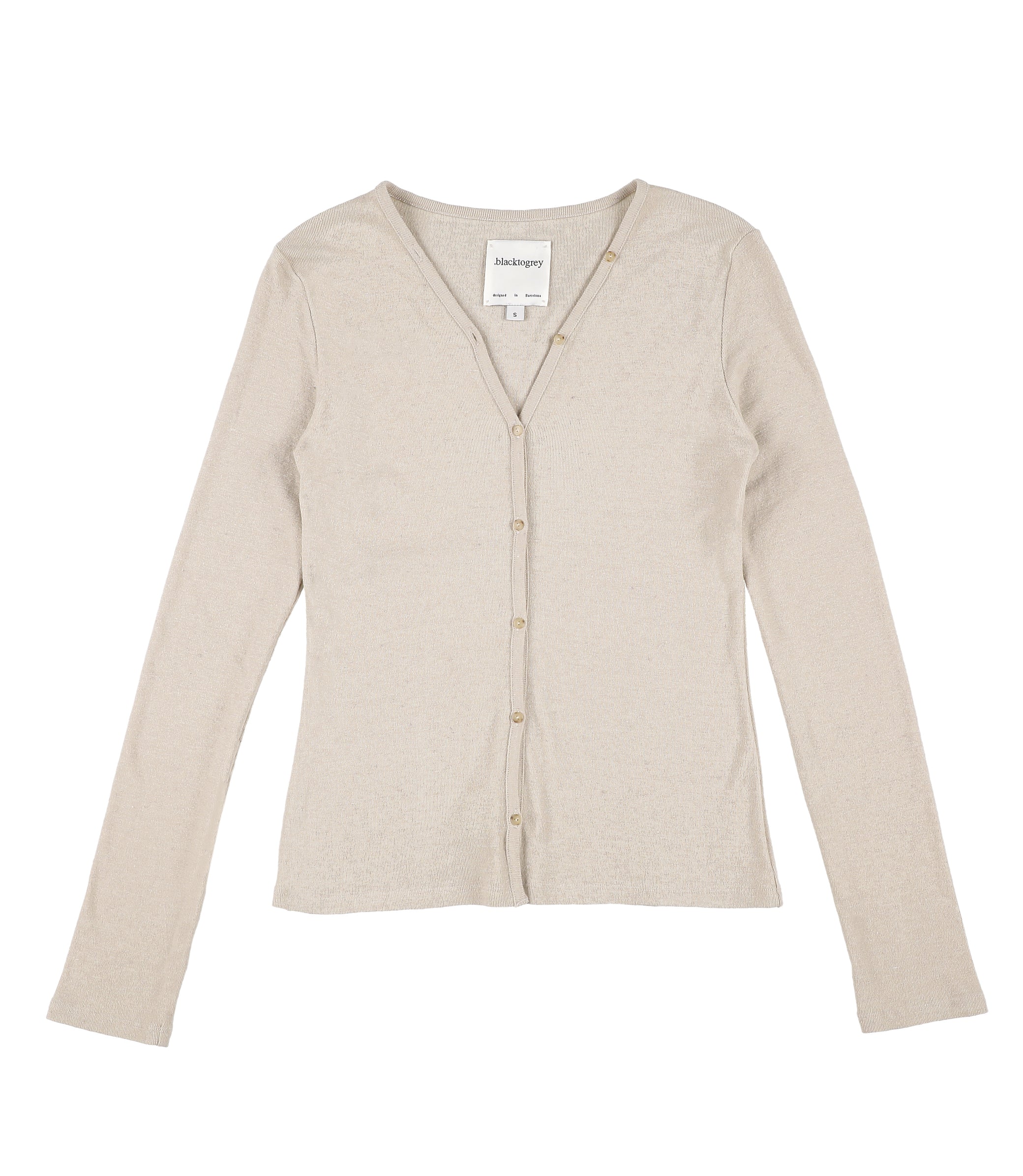 Explore our slim-fitted wool cardigan in a soothing beige shade. It's made from a blend of Ecovero Viscose and Recycled Wool. Whether paired with the Views top or worn on its own, this cardigan adds a touch of classiness to any outfit, making it a versatile wardrobe essential.