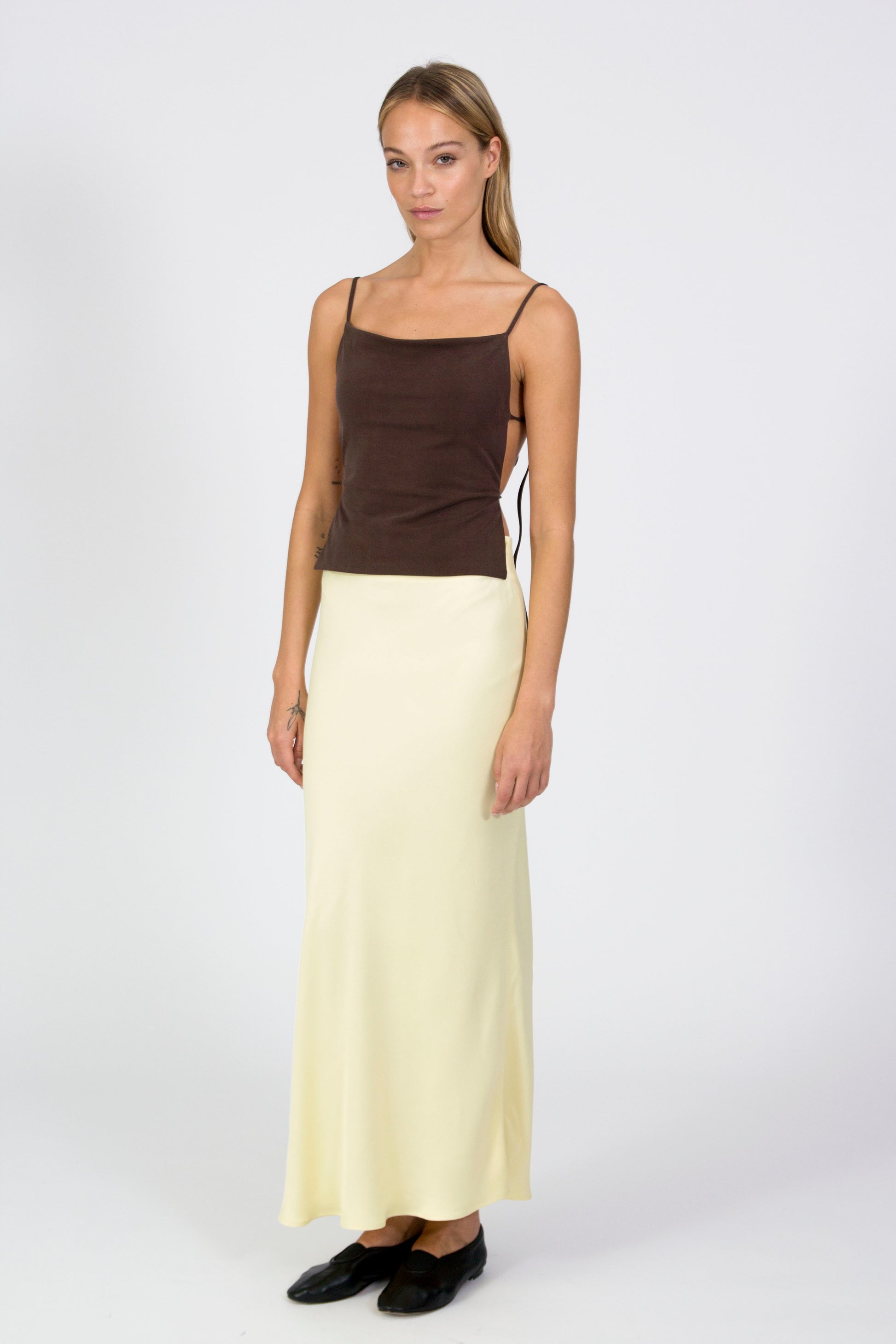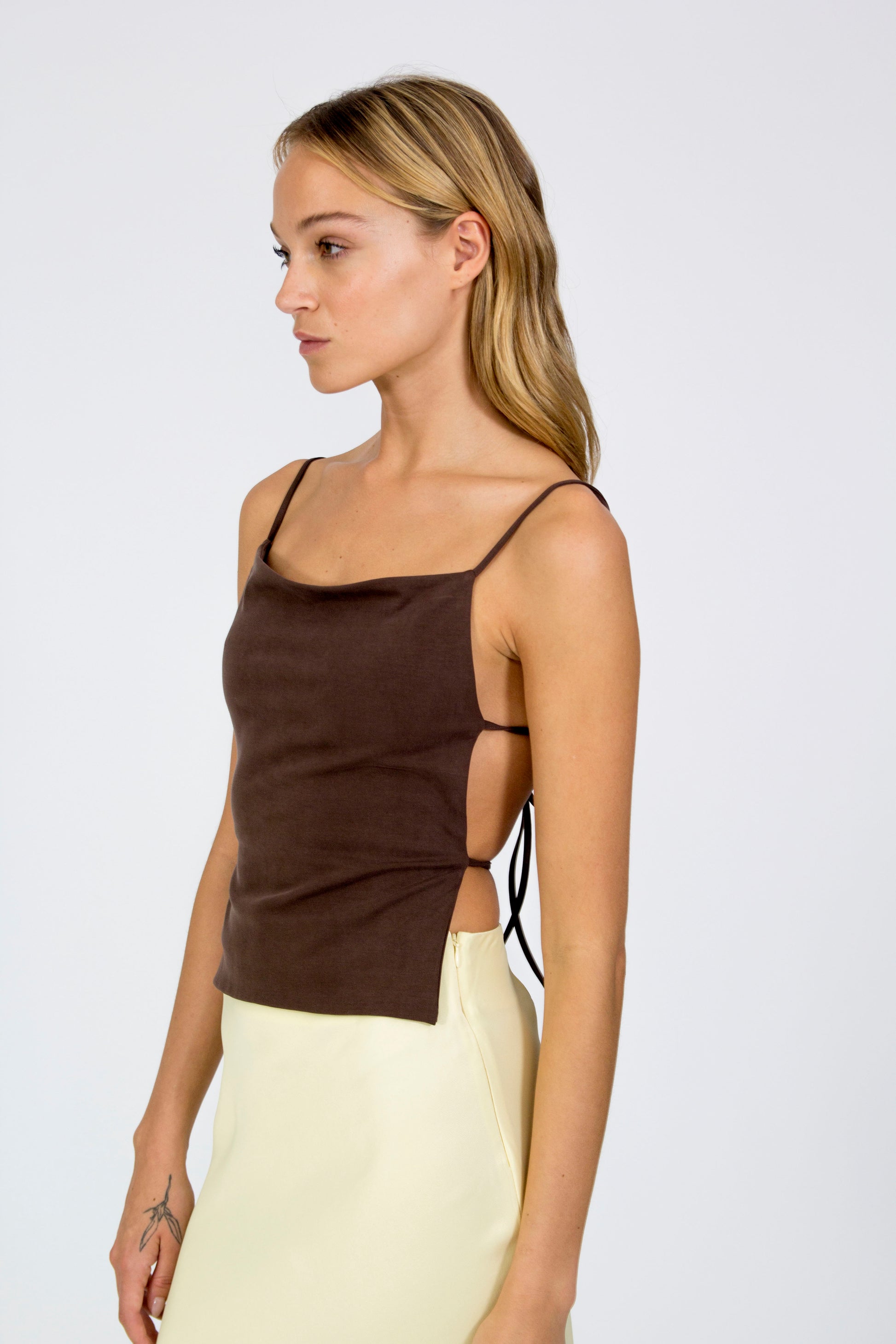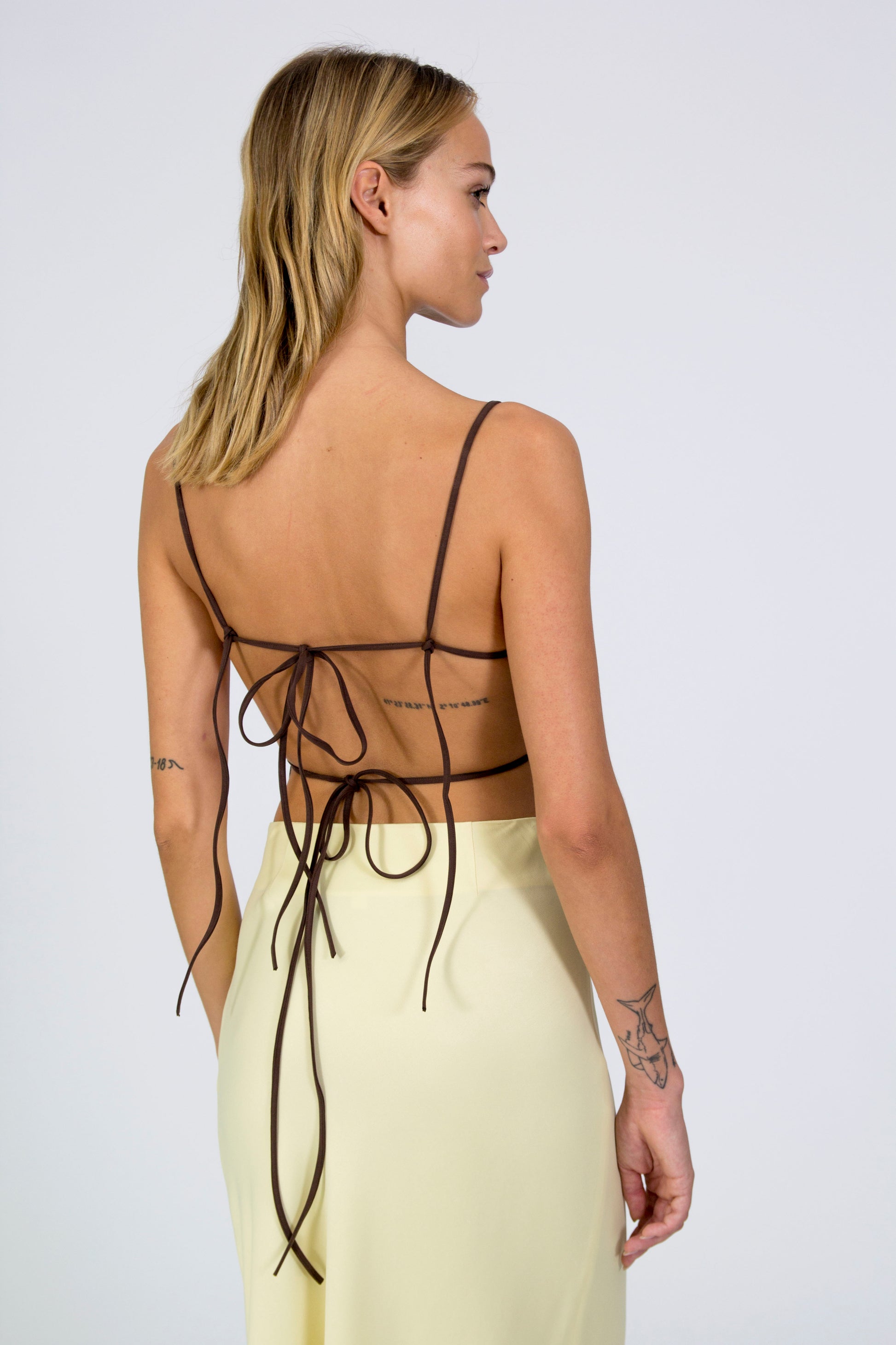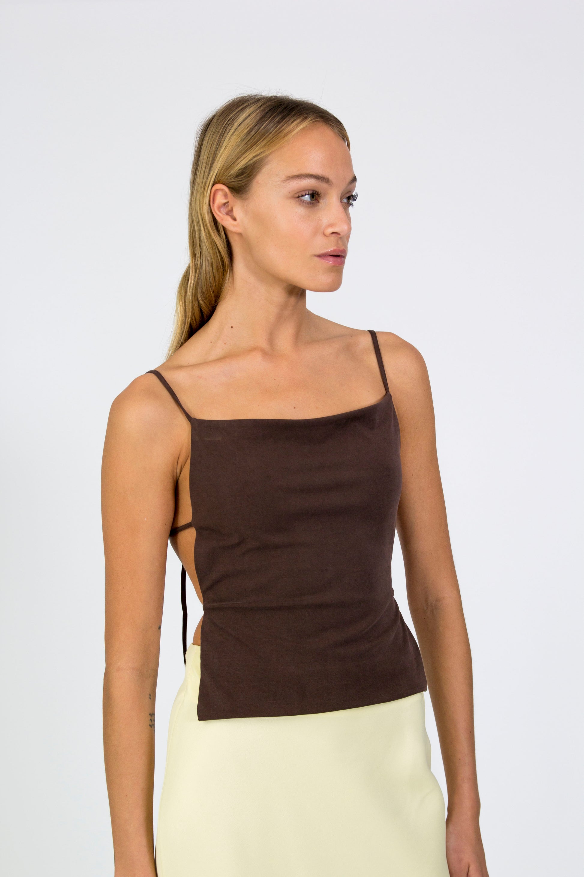 A sleek and modern top with a fully adjustable open-back design, tied with delicate straps for a custom fit. Crafted with a double-layered fabric to provide coverage without compromising on elegance, it offers a smooth and flattering silhouette. Available in cream and brown, this versatile piece is perfect for effortless styling, blending minimalism with a bold, contemporary edge.